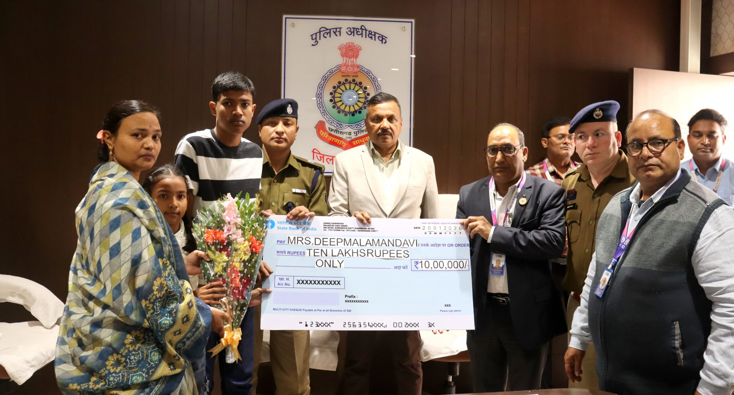 पुलिस सैलरी पैकेज योजना अंतर्गत कबीरधाम जिले के दिवंगत पुलिस कर्मियों के परिजनों को 10–10 लाख रुपये की आर्थिक सहायता चेक का वितरण