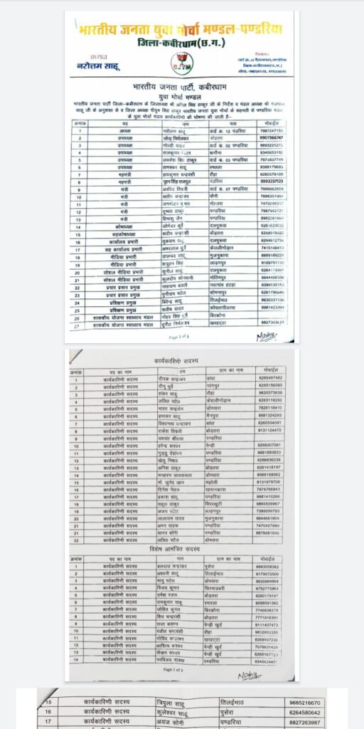 उपाध्यक्ष नरेंद्र निर्मलकर, उपाध्यक्ष गोल्डी यादव, उपाध्यक्ष राजकुमार नेताम, उपाध्यक्ष लोकेश सिंह ठाकुर ,उपाध्यक्ष तामस्कर साहू ,महामंत्री झयकुमार चंद्रवंशी, महामंत्री पूरन सिंह राजपूत, मंत्री अरविंद तिवारी, मंत्री सतीश चंद्राकर, मंत्री जगमोहन कुमार साहू, मंत्री दुष्यंत ठाकुर ,मंत्री हिमांशु जैन, कोषा अध्यक्ष जोगेंद्र कुर्रे, सह कोषाध्यक्ष संदीप चंद्रवंशी कार्यालय प्रभारी तुकाराम साहू सह कार्यालय प्रभारी अमरलाल धुर्वे मीडिया प्रभारी डालचंद साहू सत्रुघन सिंह सोशल मीडिया प्रभारी सुनील साहू कुलदीप सोनवानी प्रचार प्रसार प्रमुख नारायण बंजारे मुनीराम पटेल प्रशिक्षण प्रमुख वीरेंद्र साहू सतीश याद सतीश यादव शासकीय योजना स्वाध्याय मंडल नोहर सिंह धुर्वे दुर्गेश निर्मलकर इसी प्रकार कार्यकारिणी सदस्य दीपक चंद्राकर दीनू धुर्वे शंकर साहू ललित पटेल भारत चंद्रसेन प्रभाकर साहू विश्वनाथ चंद्राकर राकेश तिवारी जसवंत श्रीवास हरेंद्र कश्यप गुड्डू देवांगन खेलु निषाद अनीश ठाकुर मनहरण जयसवाल मोहम्मद जुनैद खान दिनेश नेताम प्रकाश साहू राहुल ठाकुर अजय पटेल लालाराम यादव अमन पाठक सागर सोनी ललित पटेल विशेष आमंत्रित सदस्य बलदाऊ चंद्राकर अश्वनी साहू मोनू पटेल विजय कुमार उमेश रजक रामकुमार साहू रोहित कुमार शिव चंद्रवंशी राजा कश्यप रंजीत चंद्रवंशी गोविंद चंद्राकर आदित्य कश्यप पैठण साहू नरविजय शाक्य त्रिपुरा साहू भुनेश्वर साहू अजय सोनी शिवकुमार साहू तामेस साहू छवि साहू,स्थाई आमंत्रित सदस्य रितेश सिंह ठाकुर सोनू सिंह ठाकुर मनमोहन साहू विशाल शर्मा शललित चंद्रवंशी हरि साहू इस प्रकार पंडरिया मंडल युवा मोर्चा की घोषणा की गई।