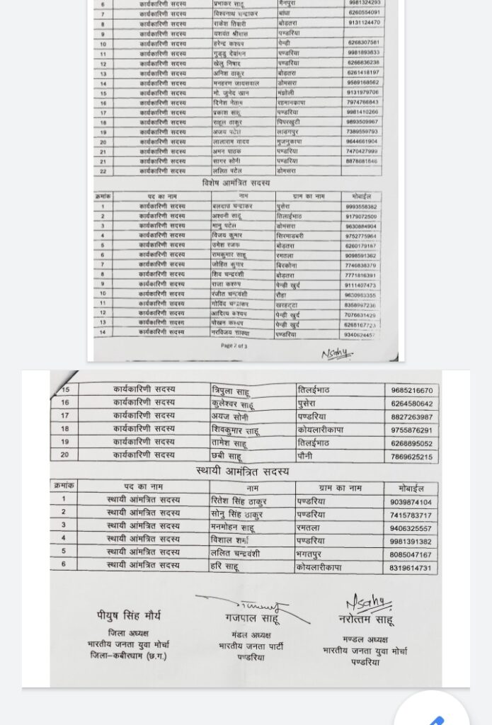 भारतीय जनता युवा मोर्चा मंडल पंडरिया जिला कबीरधाम कार्यकारिणी घोषित