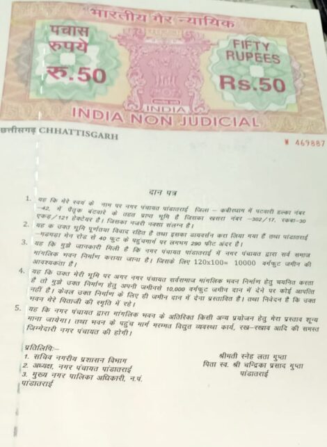 पांडातराई नगर पंचायत अध्यक्ष फिरोज खान के प्रयास और उनके नेतृत्व में नगर पंचायत पांडातराई में चारो ओर विकास कार्य और बेहतर कुशल नेतृत्व को देखते हुए नगर के प्रतिष्ठित परिवार गुप्ता परिवार के स्नेहा गुप्ता ने अपने पिता स्व. चंद्रिका प्रसाद गुप्ता की स्मृति में नगर वासियों के लिए सर्व समाज मांगलिक भवन हेतु नगर पंचायत को उक्त जमीन को दिया।अध्यक्ष फिरोज खान ने किया पहल उक्त भूमि पांडातराई में नगर पंचायत के वार्ड क्रमांक 4 मडमड़ा रोड पर है जो कि काफी महंगी जमीन है फिरोज खान ने नगर वासियों को वैवाहिक व अन्य सामाजिक कार्य में हो रही असुविधा को देखते हुए गुप्ता परिवार के समक्ष इस बात को रखते हुए उन्हें प्रेरित किया और गुप्ता परिवार ने भी फिरोज खान को निराश न करते हुए सर्व समाज मांगलिक भवन के लिए उक्त जमीन दान कर दी ।यह जमीन और बनने वाले भवन का देख रेख नगर पंचायत करेगी।