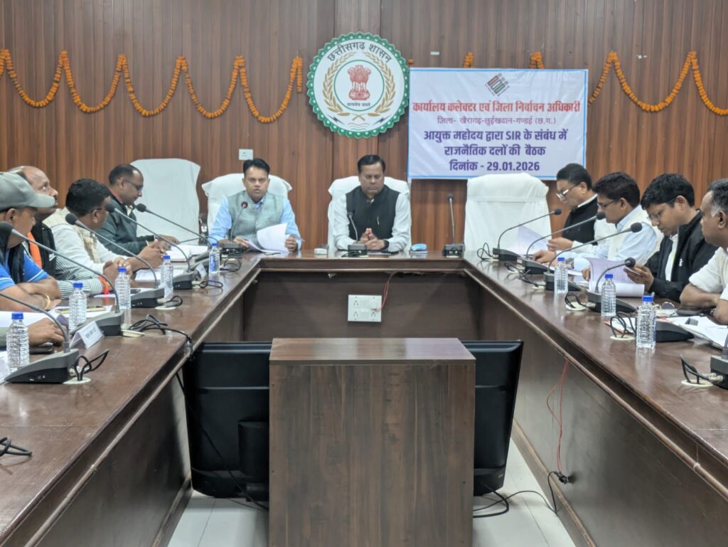 खैरागढ़ : भारत निर्वाचन आयोग, नई दिल्ली के निर्देशानुसार निर्वाचक नामावलियों के विशेष गहन पुनरीक्षण (अर्हता तिथि 01.01.2026) के संबंध में आयुक्त, दुर्ग संभाग, दुर्ग एवं रोल ऑब्जर्वर, दुर्ग संभाग सत्यनारायण राठौर की अध्यक्षता में आज कलेक्ट्रेट सभा कक्ष में मान्यता प्राप्त राजनैतिक दलों की उपस्थिति में बैठक आयोजित की गई।