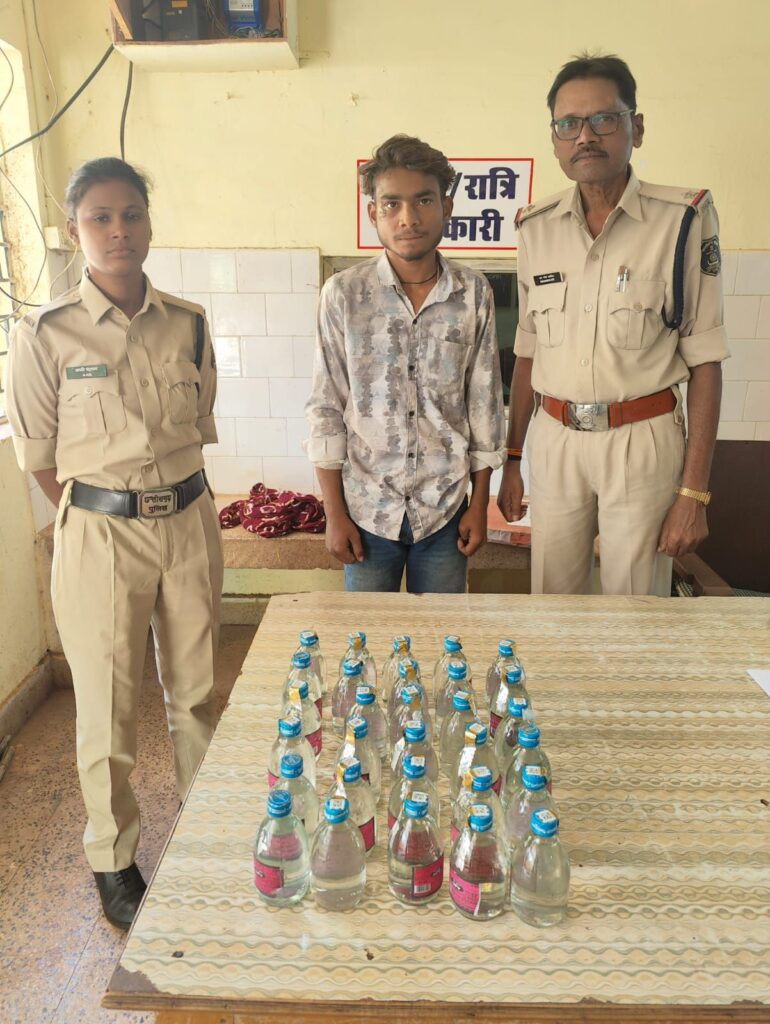 छुईखदान थाना क्षेत्र में एक व्यक्ति अवैध रूप से देशी प्लेन शराब रखे गिरफ्तार ।