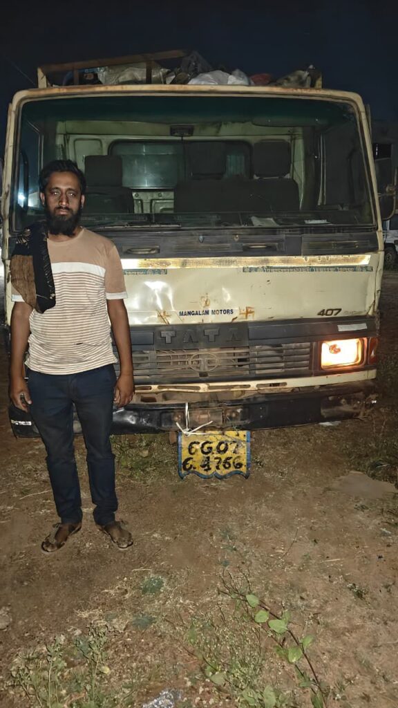 सूचना पर थाना खैरागढ़ पुलिस द्वारा तत्काल मौके पर पहुंचकर घेराबंदी कर रेड कार्यवाही की गई। कार्यवाही के दौरान मोहम्मद शबीर पिता मोहम्मद फारुख, उम्र 30 वर्ष, निवासी दाऊचौरा खैरागढ़ को टाटा मेटाडोर वाहन क्रमांक CG 07 C 4766 में कबाड़ सामान भरकर ले जाते हुए पकड़ा गया।