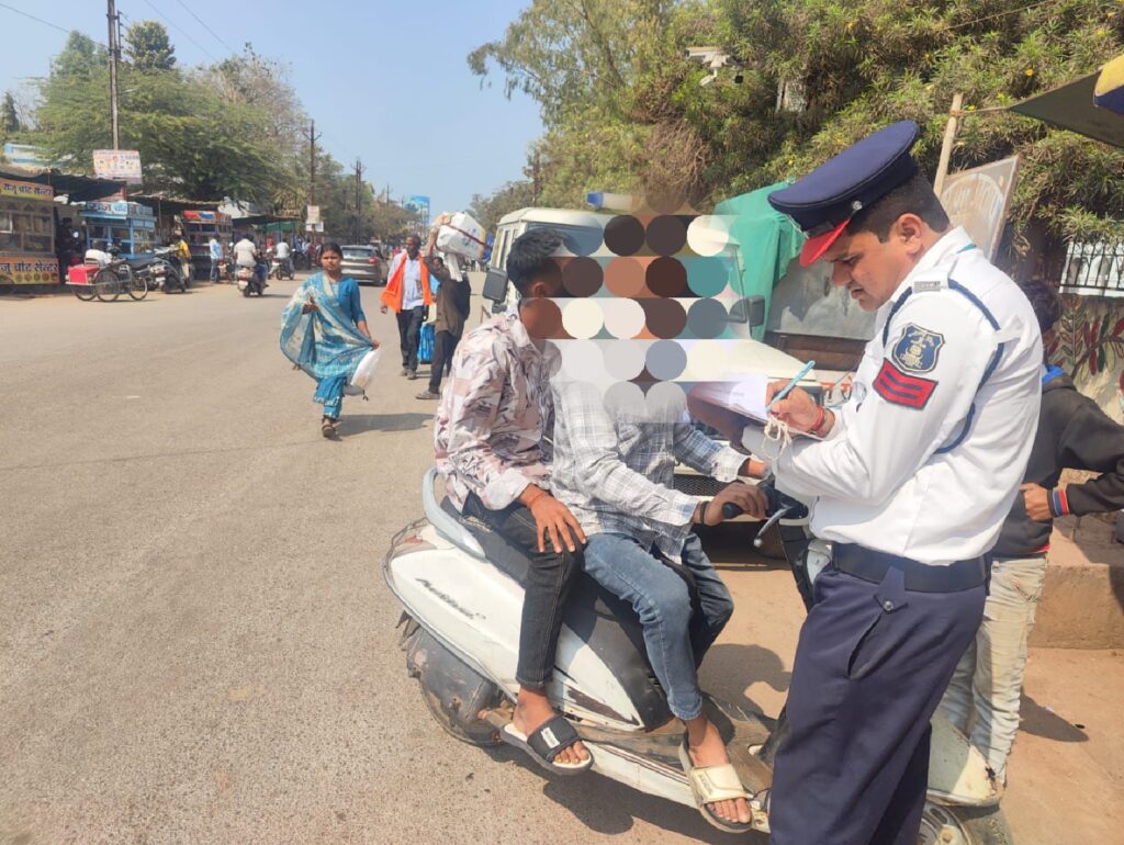 यातायात पुलिस खैरागढ़ द्वारा वरिष्ठ अधिकारियो से प्राप्त दिशा -निर्देशानुसार सड़क दुर्घटनाओ मे कमी लाने नित नए प्रयोग के साथ ही आमजनों के बीच जाकर लोगो की जान माल की रक्षा हेतु पिछले पूरे एक माह जन जागरूकता का कार्यक्रम चलाया गया था . जागरूकता अभियान उपरांत सड़क दुर्घटनाओं पर अंकुश लगाने हेतु विशेषरूप से नाबालिक बच्चों के द्वारा वाहन चलाने के प्रकरणों में कार्यवाही करते हुयें खैरागढ़ मुख्य टेंपो चौक में चेकिंग में नाबालिक बच्चो द्वारा वाहन चलाने के प्रकरण व उनके वाहन स्वामियो पर तथा 07 बिना लाइसेंस व अन्य 05 प्रकरणों में चालानी कार्यवाही कर कुल 21 प्रकरण मे 28100 रूपये का अर्थदंड मोटर व्हीकल अधिनियम के अंतर्गत वसूला गया।भविष्य में भी यह कार्यवाही निरंतर जारी रहेगी. जिला पुलिस के सी जी आप सभी से अपील करती है कि यातायात नियमों का पालन कर पुलिस का सहयोग करे.