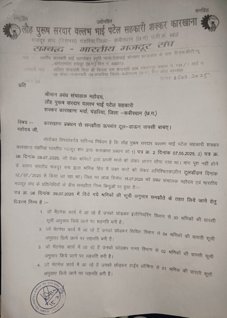 टीकम निर्मलकर AP न्यूज़ पंडरिया: लौह पुरुष सरदार वल्लभ भाई पटेल सहकारी शक्कर कारखाना पंडरिया में भारतीय मजदूर संघ द्वारा श्रमिकों की मांगों को लेकर चल रही अनिश्चितकालीन टूल-डाउन हड़ताल आज दिनांक 15 जुलाई 2025 को समाप्त हो गई। कारखाना प्रबंधन और भारतीय मजदूर संघ के प्रतिनिधियों के बीच हुए समझौते के बाद श्रमिकों ने अपना काम फिर से शुरू कर दिया है।