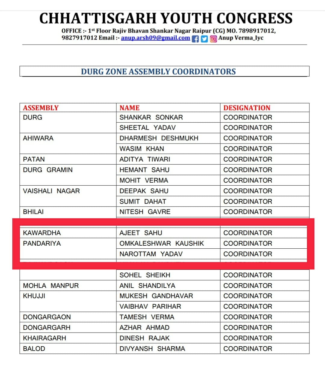 अजीत साहू ने बताया कि मुझे संगठन में इतनी बड़ी जिम्मेदारी देने के लिए युवा कांग्रेस प्रदेश अध्यक्ष कोको पाढ़ी भैया जी केके शास्त्री जी छत्तीसगढ़ युवा कांग्रेस सोशल मीडिया के चेयरमैन अनूप वर्मा प्रदेश सहसचिव जिला पंचायत सदस्य भैया तुकाराम चंद्रवंशी दुर्ग संभाग के प्रभारी सौरभ पवार जिला संयोजक अरमान खान एवम अरविंद चंद्रवंशी युवा कांग्रेस बोड़ला ब्लॉक अध्यक्ष मनोज वर्मा,हुसैन खान ,व्यास चंद्राकर ,का आभार व्यक्त किया।