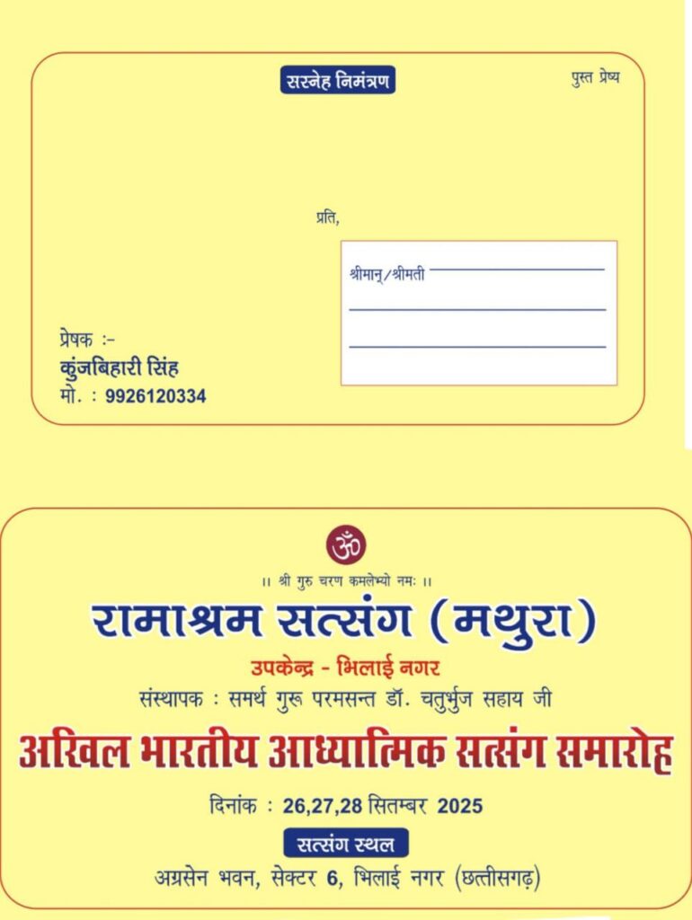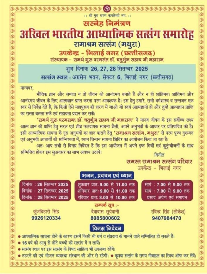 भिलाई – प्राप्त जानकारी अनुसार रामाश्रम सत्संग मथूरा के तत्वावधान में 26/27/28 सितंबर को अखिल भारतीय in आध्यात्मिक सत्संग समारोह छत्तीसगढ़ के मुख्य आचार्य श्री कुंज बिहारी सिंह के सानिध्य में होने जा रहा है।