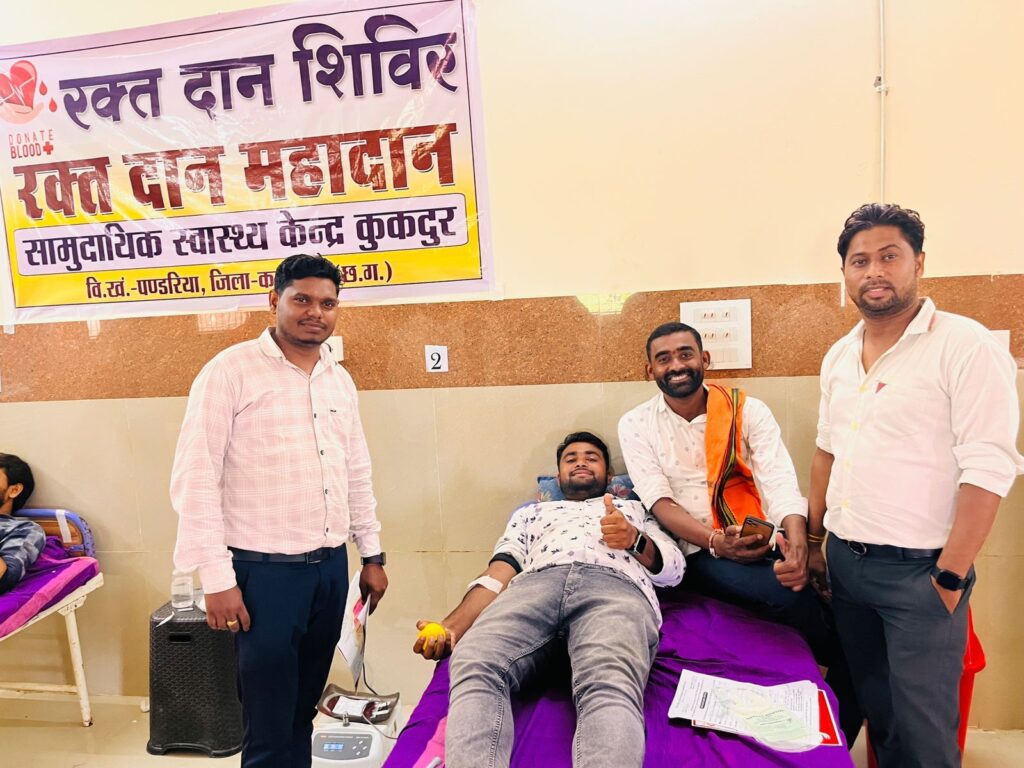 कुई-कुकदूर – भारतीय जानता पार्टी युवा मोर्चा कुकदुर मण्डल द्वारा रक्तदान शिविर में रक्तदान किया और लोगों को रक्तदान के प्रति जागरूक होने का संकल्प दिलाए।जिसमे कुकदूर मण्डल अध्यक्ष, दशरथ कुंभकार , उपाध्यक्ष- यशवंत श्रीवास , राकेश डड़सेना ,रोहित परस्ते, आनंद जैन ,आकाश कुम्भकार, अश्वनी कुम्भकार,राकेश पन्द्राम,श्री नायक,और सभी कार्यकर्ता उपस्थित रहे। इस अवसर पर डाक्टर प्रसंगिना साधु, धीरज महोबिया आर एम ओ सहित स्वास्थ्य कर्मचारी उपस्थित रहे।
