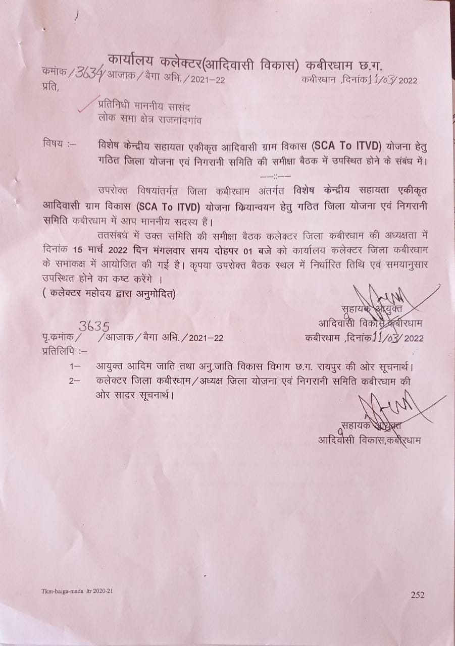 कबीरधाम कलेक्टर के आदेश अनुसार विशेष केंद्रीय सहायता एकीकृत आदिवासी ग्राम विकास योजना क्रियान्वयन हेतु गठित जिला एवं निगरानी समिति कबीरधाम में चंद्र कुमार सोनी सदस्य हैं, उक्त संबंध में समिति की समीक्षा बैठक कलेक्टर जिला कबीरधाम की अध्यक्षता में मंगलवार को दोपहर 1:00 बजे कलेक्टर कार्यालय में आयोजित किया जाएगा।