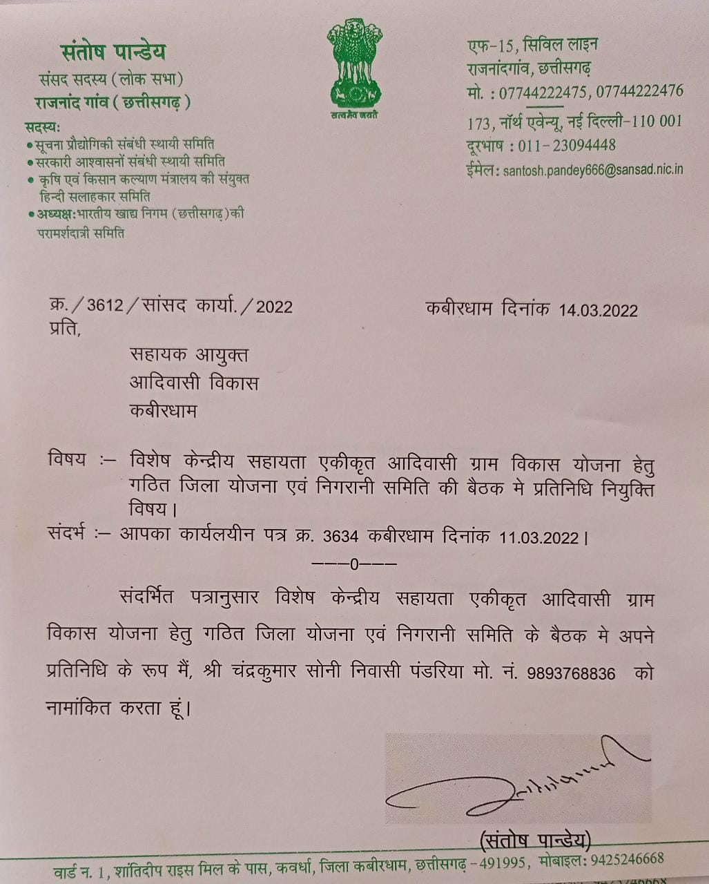 कवर्धा। राजनांदगांव लोकसभा क्षेत्र सांसद संतोष पांडे ने विशेष केंद्रीय सहायता एकीकृत आदिवासी ग्राम विकास योजना हेतु गठित जिला योजना एवं निगरानी समिति की बैठक में अपने प्रतिनिधि के रुप में पंडरिया निवासी चंद्रकुमार सोनी को नामांकित किया है.