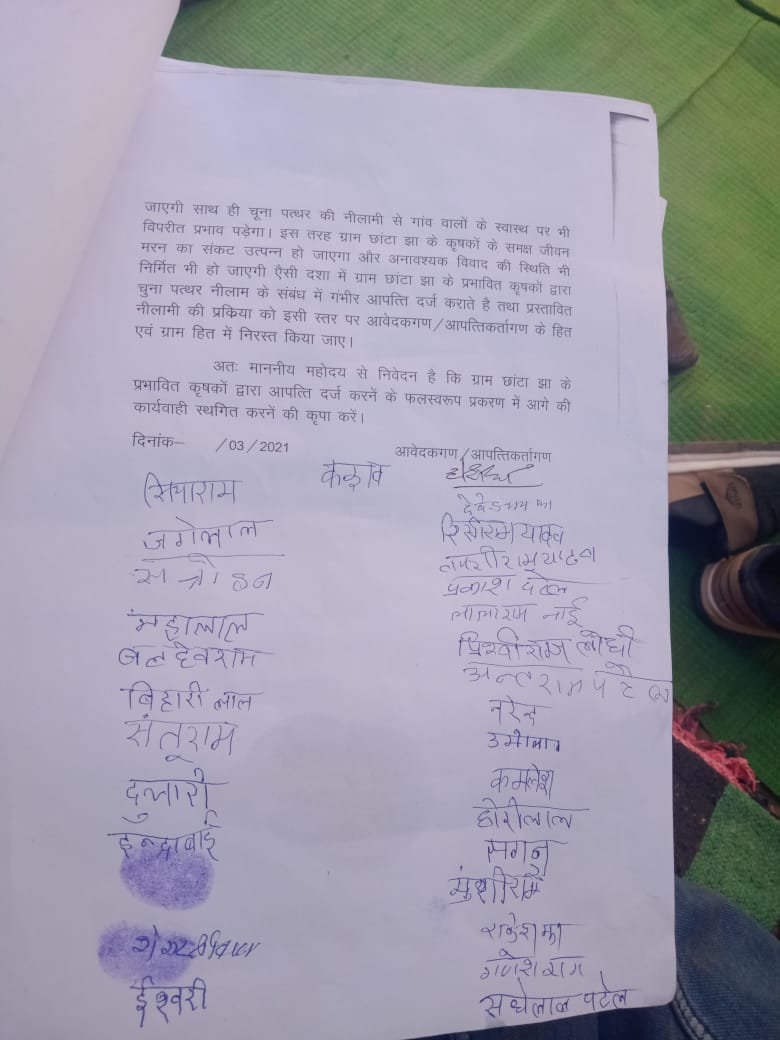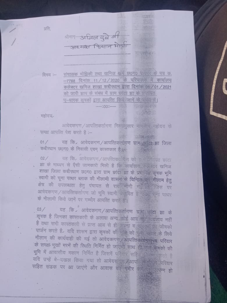 कवर्धा:छत्तीसगढ़ संयुक्त किसान मोर्चा जिला कबीरधाम संभावित चूना खदान के विरोध में प्रभावित होने वाले गांव छाटा झा बीरू टोला भी कुड़िया सोहागपुर मैनपुरी धमकी छत्तीसगढ़ संयुक्त किसान मोर्चा के प्रदेश अध्यक्ष अनिल दुबे जी के अगुवाई में बैठक ग्राम पंचायत छाटा झा में रखा गया था जिसमें अनिल दुबे जी ने किसानों से कहा की ग्राम पंचायत और ग्राम वासियों की सहमति के बगैर कुछ नहीं हो सकता तो किसानों से आग्रह किया कि आप लोग सहमति कभी ना देवे जिसमें किसानों के समर्थन में किसान मोर्चा हमेशा साथ रहेंगे जिसमें मुख्य रुप से जिला अध्यक्ष महेंद्र कौशिक कवर्धा ब्लॉक अध्यक्ष जय करण पटेल बोड़ला ब्लॉक अध्यक्ष रामदास पटेल लोहारा ब्लॉक अध्यक्ष योगेश शर्मा रामपुर ब्लॉक अध्यक्ष जगतारण सिंह ठाकुर जलेश्वर राजपूत एवं 5 से 6 गांव के सैकड़ों किसान उपस्थित थे
