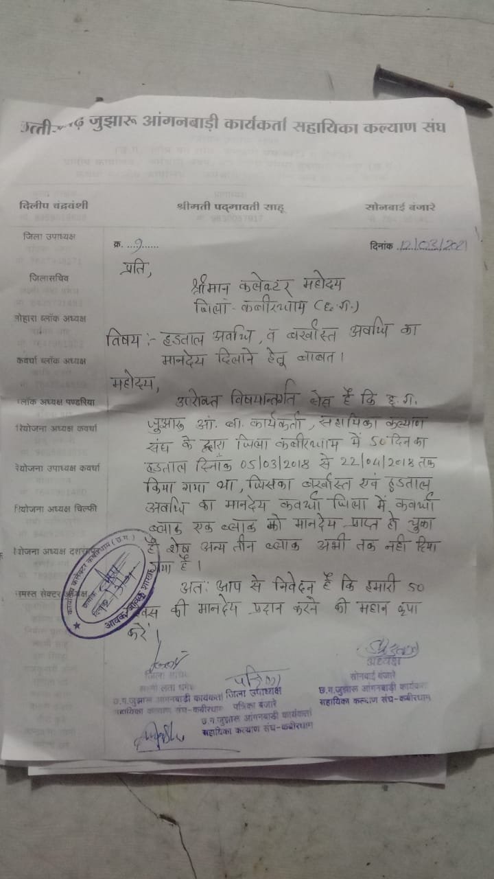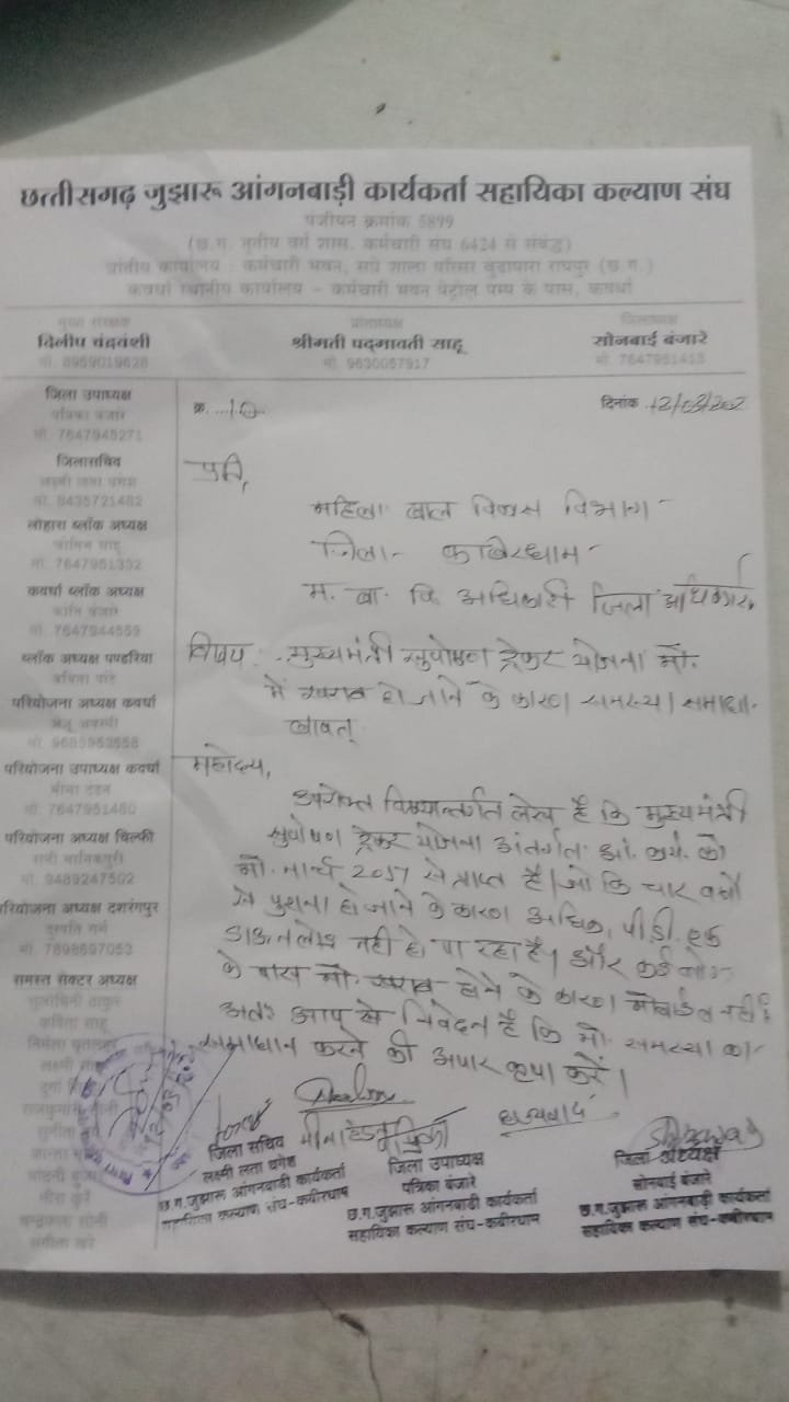 कवर्धा। जुझारू आंगनबाड़ी कार्यकर्ता सहायिका की जिला अध्यक्ष सोनबाई बंजारे ने कलेक्टर एवं महिला बाल विकास अधिकारी डी.पी.ओ सर को सौंपा ज्ञापन| जिला अध्यक्ष सोनबाई बंजारे जिला सचिव लक्षमीलता धगेश परियोजना उपाध्यक्ष मीना टन्डन नीलिमा गुप्ता एवं जिला कि समस्त कार्यकर्ताओं सहायिकाओ ने अपनी बाते रखी (1) हमारे जिला में हड़ताल अवधि एवं बर्खास्त अवधि का राशि सिर्फ कवर्धा ब्लॉक को मिला है, तीन ब्लॉक लोहारा पंडरिया बोडला को नहीं मिला है, अतः तीनों ब्लॉक को हड़ताल अवधि एवं बर्खास्त अवधि का पैसा दिलाई जाये| (2) नया एप्स मुख्यमंत्री सुपोषण ट्रैकर आया है जिसे मोबाइल में डाउनलोड करने के लिए कहा जा रहा है, सुपोषण ट्रैकर डाउनलोड नहीं होने की स्थिति में या कार्य नहीं करने की स्थिति में कार्यकर्ताओं का मानदेय काट दिया जाएगा। और जो मोबाइल आंगनबाड़ी कार्यकर्ताओं को मिला था, 2017 में वह 4 साल पुराना हो चुका है| और अच्छी गुणवत्ता नहीं होने के कारण कई बहनों का मोबाइल खराब हो चुका है,और मोबाइल खराब होने के कारण कई बहनों के पास मोबाइल ही नहीं है,एवं हमारी कार्यकर्ता बहने अधिकतर विधवा एवं परित्यकता है| और हमारी मानदेय 6500 है,अब कार्यकर्ताओं की यह समस्या हो गई है ,कि जिनका मोबाइल खराब हो चुका है वह 6500 में मोबाइल खरीदे या अपना घर का राशन? मोबाइल खराब होने की स्थिति में सुपोषण ट्रैकर डाउनलोड नहीं हो पा रहा है,इस समस्या का समाधान कीजिए| 03 और जिले की सभी छोटी छोटी समस्या ओ को निदान करने आग्रह किया गया|