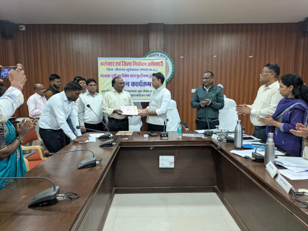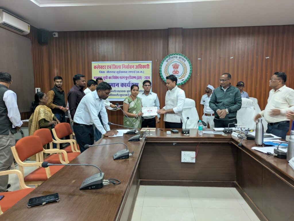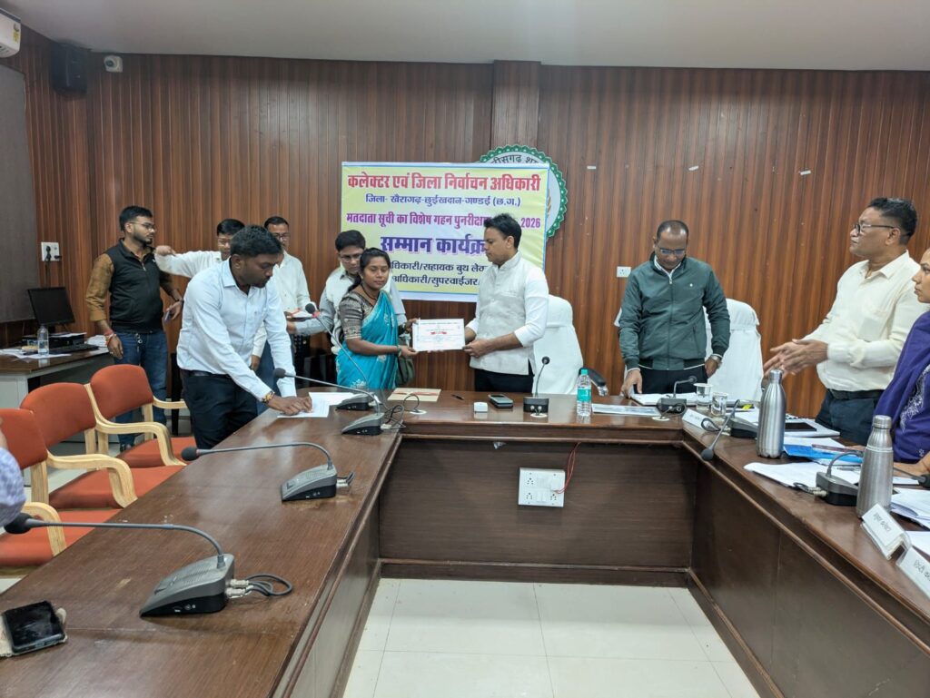 अभिनव पहल खैरागढ़ : विशेष संक्षिप्त पुनरीक्षण-2026 के अंतर्गत मतदान केन्द्रों के गणना प्रपत्रों के शत-प्रतिशत डिजिटाइजेशन में उत्कृष्ट प्रदर्शन करने वाले बूथ लेवल अधिकारियों को आज कलेक्टर एवं जिला निर्वाचन अधिकारी इंद्रजीत सिंह चंद्रवाल द्वारा सम्मानित किया गया। मुख्य निर्वाचन पदाधिकारी, छत्तीसगढ़ के निर्देशानुसार ऐसे सभी बीएलओ को प्रोत्साहित किया जा रहा है, जिन्होंने 26 नवम्बर 2025 की निर्धारित समय-सीमा से पूर्व अपना डिजिटाइजेशन कार्य पूर्ण कर लिया। इसी क्रम में विधानसभा क्षेत्र क्रमांक 73-खैरागढ़ तथा 74-डोंगरगढ़ (आंशिक) के छह बीएलओ ने 24 नवम्बर की किया।