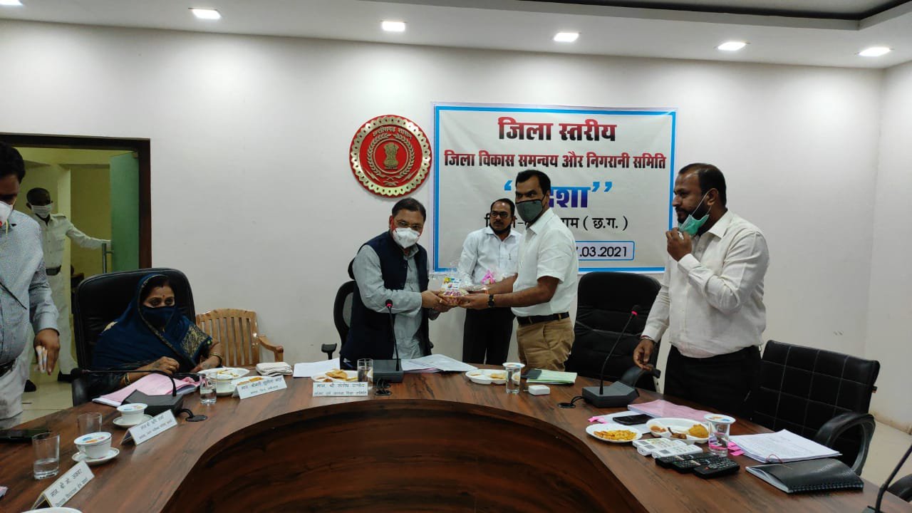 कवर्धा, 27 मार्च 2021। जिला विकास समन्वय एवं निगरानी समिति (दिशा) की बैठक के पश्चात कलेक्टर श्री रमेश कुमार शर्मा ने सांसद श्री संतोष पाण्डेय, जिला पंचायत अध्यक्ष श्रीमती सुशीला भट्ट, नगर पालिका अध्यक्ष श्री ऋषि शर्मा को कबीरधाम जिले की महिला स्व. सहायता समूह द्वारा बनाई गई हर्बल गुलाल भेंट की।