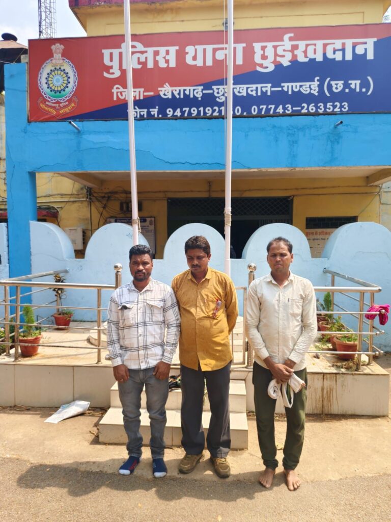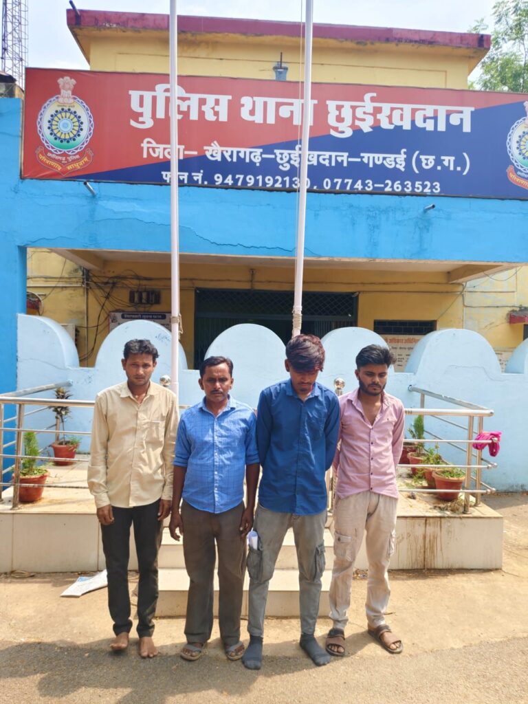 खैरागढ़/छुईखदान । जिला के सी जी पुलिस द्वारा जिले में आपराधिक गतिविधियों के विरुद्ध निरंतर प्रभावी कार्यवाही की जा रही है। इसीक्रम में दिनांक 24.04.2026 को मुखबिर से सूचना प्राप्त हुई कि ग्राम पुरेना में स्कूल के पास मैदान में कुछ व्यक्ति 52 पत्ती ताश के माध्यम से रुपए-पैसों का दांव लगाकर काट पत्ती नामक जुआ खेल रहे हैं।सूचना पर तत्काल मौके पर पहुंचकर घेराबंदी कर रेड कार्यवाही की गई। कार्यवाही के दौरान निम्न आरोपी पकड़े गए