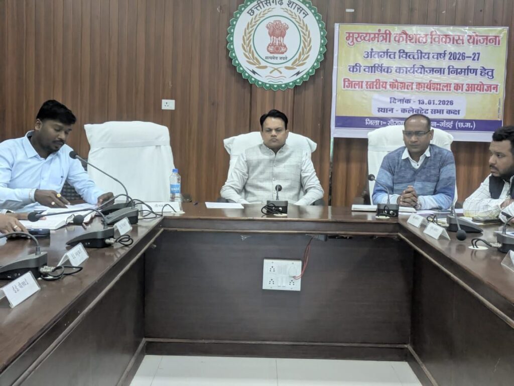 कार्यालय जिला कौशल विकास प्राधिकरण, जिला खैरागढ़–छुईखदान–गण्डई के तत्वावधान में आज माननीय कलेक्टर महोदय की अध्यक्षता में कलेक्टर सभा कक्ष, खैरागढ़ में मुख्यमंत्री कौशल विकास योजना अंतर्गत वित्तीय वर्ष 2026-27 की मांग आधारित वार्षिक कौशल कार्य योजना तैयार करने हेतु जिला स्तरीय कार्यशाला का आयोजन किया गया।