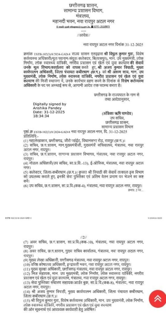 जारी आदेश के अनुसार वर्तमान में विशेष कर्तव्यस्थ अधिकारी के रूप में पदस्थ विपुल कुमार गुप्ता (मूल पद—संयुक्त कलेक्टर, बिलासपुर) की सेवाएं उनके मूल विभाग को वापस कर दी गई हैं। आदेश छत्तीसगढ़ के राज्यपाल के नाम से 31 दिसंबर 2025 को जारी किया गया है।