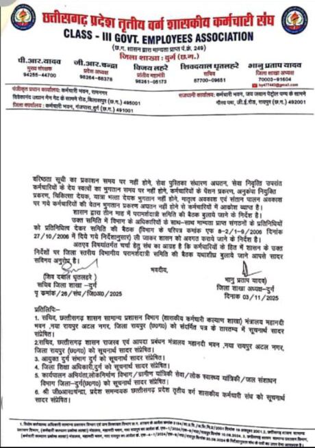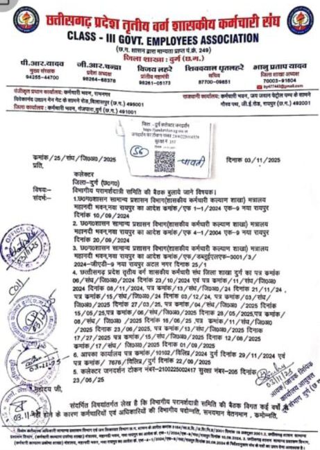 जिला दुर्ग – प्राप्त जानकारी अनुसार छत्तीसगढ़ प्रदेश तृतीय वर्ग शासकीय कर्मचारी संघ जिलाध्यक्ष भानु प्रताप यादव ने लेख किया है की उनके द्वारा ग्यारह बार जिला प्रशासन को विभागीय परामर्शदात्री समिति की बैठक आयोजित करने पत्र लिखा गया है। परंतु मान्यता प्राप्त संघ के पत्रों की लगातार अनदेखी की जा रही है।