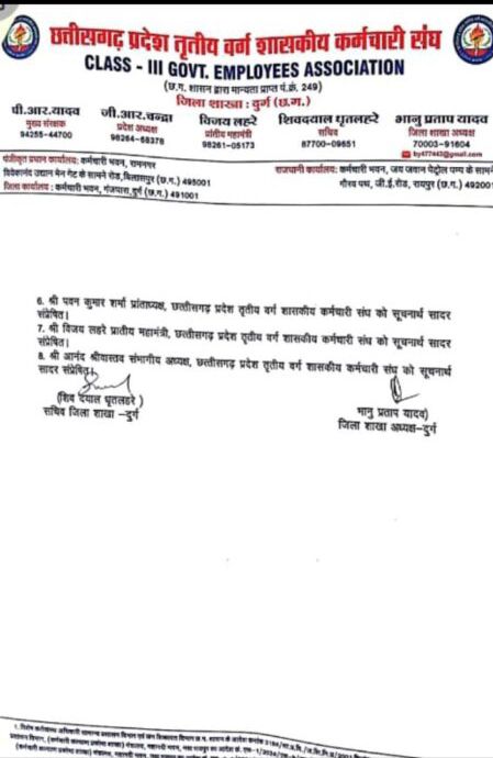 शासन के उक्त निर्देशानुसार विभागीय परामर्शदात्री समिति की बैठक आयोजित करने छत्तीसगढ़ प्रदेश तृतीय वर्ग शासकीय कर्मचारी के जिलाध्यक्ष एवं छ0ग0कर्मचारी अधिकारी फेडरेशन-दुर्ग के मीडिया प्रभारी भानु प्रताप यादव एवं जिला सचिव शिवदयाल धृतलहरे ने संयुक्त हस्ताक्षर युक्त ज्ञापन कलेक्टर  दुर्ग को प्रेषित किया गया।