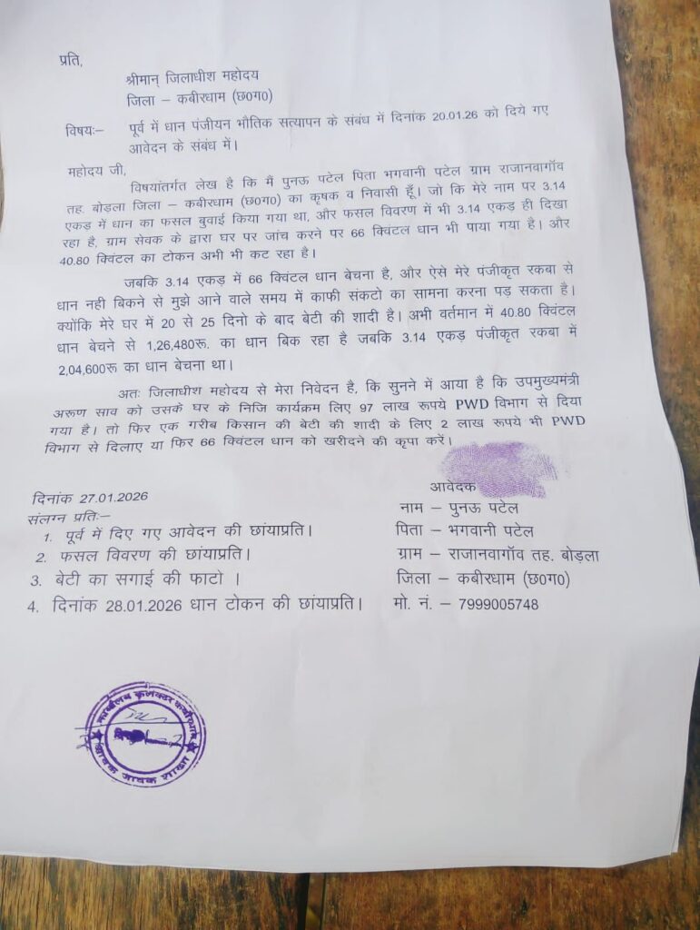 कवर्धा : धान नहीं बिकने से किसान परेशान.बेटी की शादी के लिए मदद के लिए कलेक्टर से लगाई गुहार