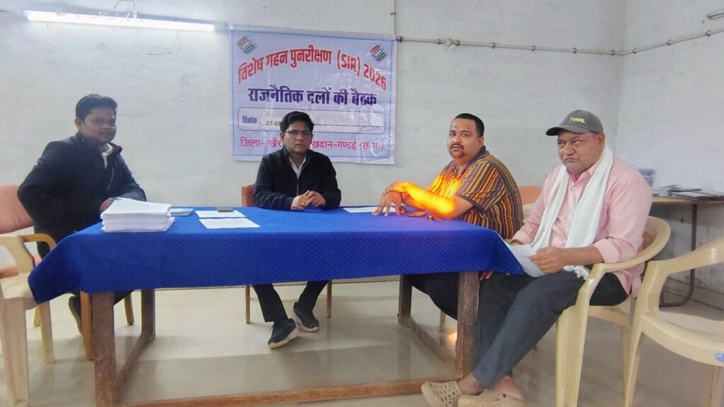 कार्यालय मुख्य निर्वाचन पदाधिकारी, छत्तीसगढ़, रायपुर के निर्देशानुसार निर्वाचक नामावलियों के विशेष गहन पुनरीक्षण कार्य को अर्हता तिथि 01.01.2026 के संदर्भ में आज दिनांक 27.01.2026 को अनुभाग स्तर पर विधानसभा निर्वाचन क्षेत्र क्रमांक 73–खैरागढ़ के निर्वाचक रजिस्ट्रीकरण अधिकारी द्वारा राजनैतिक दलों के पदाधिकारियों की पाँचवीं साप्ताहिक बैठक संध्या 4:00 बजे आयोजित की गई। बैठक में शशांक ताम्रकार, जिला महामंत्री, भारतीय जनता पार्टी एवं रविन्द्र सिंह गहरवार, भारतीय राष्ट्रीय कांग्रेस पार्टी के प्रतिनिधि उपस्थित रहे।