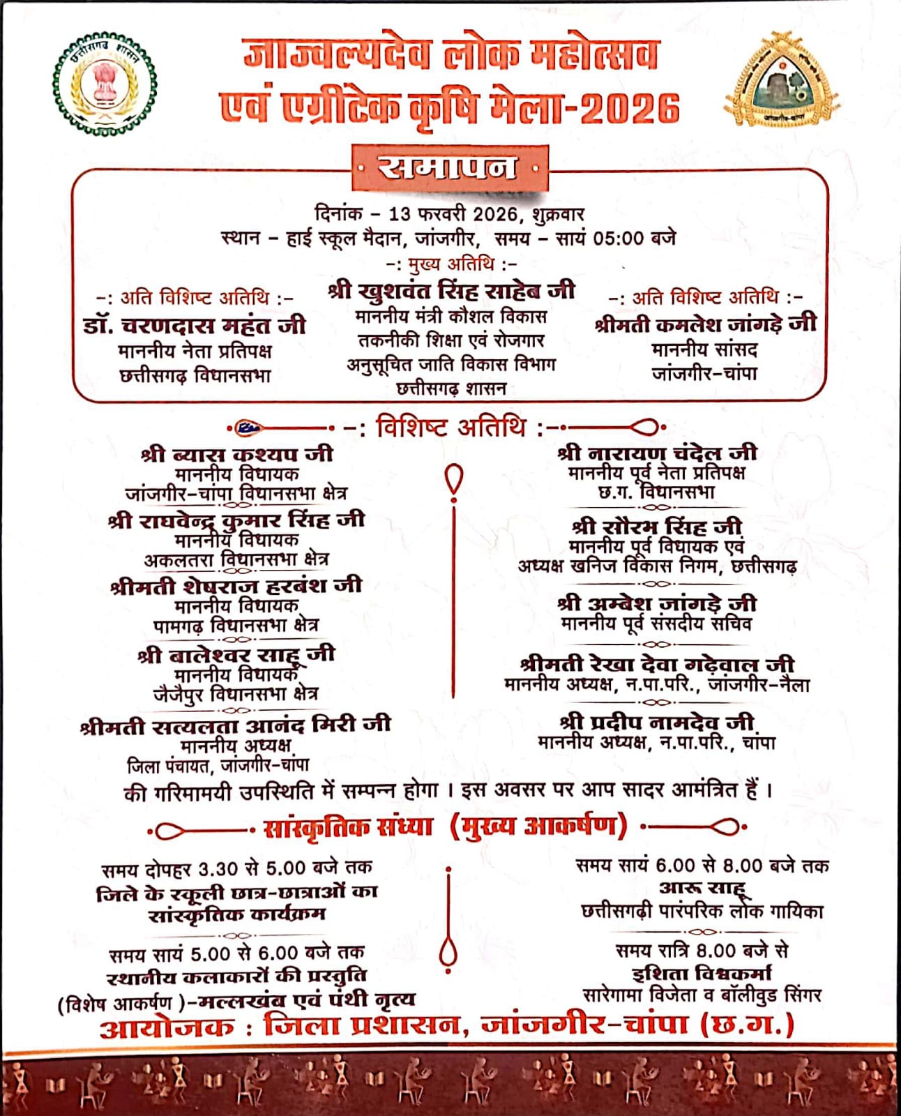 रायपुर, 12 फरवरी 2026/जांजगीर-चांपा जिले के शासकीय हाई स्कूल मैदान, जांजगीर तथा कृषि विज्ञान केन्द्र जर्वेे, जांजगीर में 11, 12 एवं 13 फरवरी 2026 तक आयोजित की जा रही है l जाज्वल्यदेव लोक महोत्सव एवं एग्रीटेक कृषि मेला 2026 का समापन समारोह 13 फरवरी को सायं 5 बजे किया जाएगा। समापन कार्यक्रम में कौशल विकास, तकनीकी शिक्षा एवं रोजगार तथा अनुसूचित जाति विकास मंत्री श्री गुरु खुशवंत सिंह साहेब मुख्य अतिथि के रूप में शामिल होंगे। कार्यक्रम में छत्तीसगढ़ विधानसभा के नेता प्रतिपक्ष डॉ. चरणदास महंत एवं जांजगीर- चांपा सांसद श्रीमती कमलेश जांगड़े अति विशिष्ट अतिथि के रूप में उपस्थित रहेंगी। इसके साथ ही विधायक जांजगीर- चांपा श्री ब्यास कश्यप, विधायक अकलतरा श्री राघवेन्द्र कुमार सिंह, विधायक पामगढ़ श्रीमती शेषराज हरवंश, विधायक जैजैपुर श्री बालेश्वर साहू, जिला पंचायत अध्यक्ष श्रीमती सत्यलता आनंद मिरी, पूर्व नेता प्रतिपक्ष श्री नारायण चंदेल, पूर्व विधायक एवं अध्यक्ष खनिज विकास निगम श्री सौरभ सिंह, पूर्व संसदीय सचिव श्री अम्बेश जांगड़े, नगर पालिका परिषद जांजगीर-नैला के अध्यक्ष श्रीमती रेखा देवा गढ़ेवाल एवं नगर पालिका परिषद चांपा के अध्यक्ष श्री प्रदीप नामदेव विशिष्ट अतिथि के रूप में शामिल होंगे।