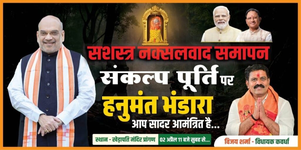 कवर्धा, 01 अप्रैल 2026। 31 मार्च 2026 की नियत तिथि तक बस्तर सहित छत्तीसगढ़ से सशस्त्र नक्सलवाद के पूर्णतः समाप्त होने की ऐतिहासिक उपलब्धि के उपलक्ष्य में 2 अप्रैल को कवर्धा स्थित खेड़ापति हनुमान जी महराज मंदिर में पावन हनुमंत भंडारा का आयोजन किया जा रहा है। इस पावन आयोजन के माध्यम से प्रदेश में स्थापित शांति, सुरक्षा और समृद्धि के नए युग का अभिनन्दन करते ईश्वर का आभार नमन-वंदन किया जाएगा।
