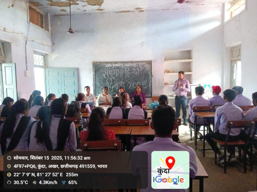 टीकम निर्मलकर AP न्यूज़ पंडरिया : नवीन शासकीय महाविद्यालय कुंडा में दिनांक 15/9/2025को राष्ट्रीय हिन्दी दिवस के अवसर पर संगोष्ठी कार्यक्रम का आयोजन किया गया। कार्यक्रम का आयोजन मुख्य रूप से महाविद्यालय के प्राचार्य डॉ ऋचा मिश्रा के निर्देशन में किया गया।