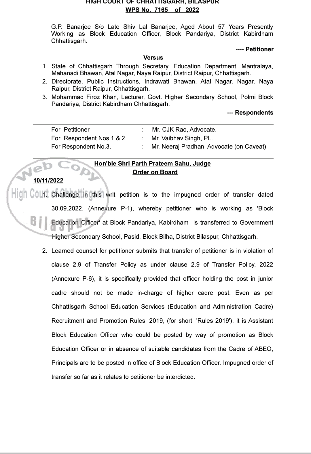 उन्हें 13/10/2022 को जिला शिक्षा अधिकारी कबीरधाम के लिए रिलिव कर दिया गया था।