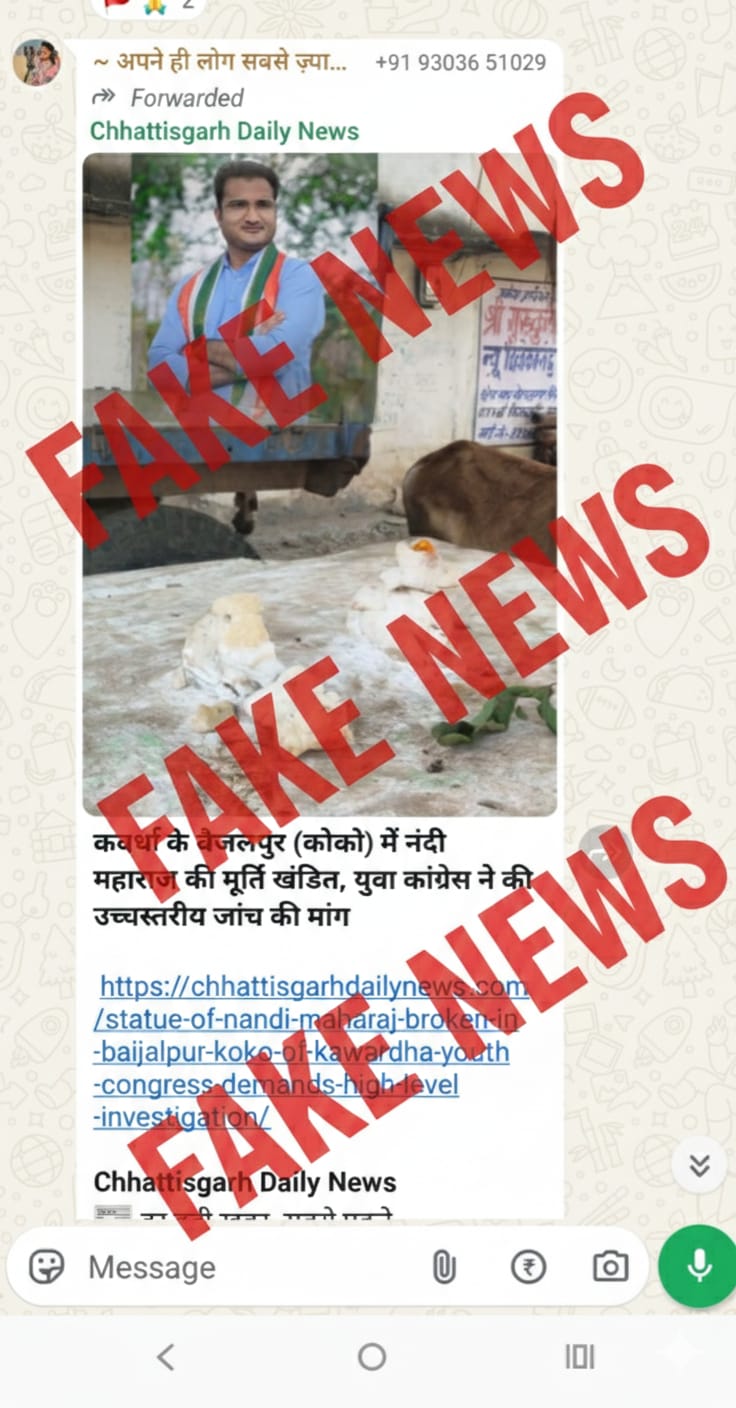जबकि वास्तविकता यह है कि गांव में बच्चों द्वारा क्रिकेट खेलने के दौरान दुर्घटनावश नंदी महाराज की मूर्ति खंडित हुई। इस संबंध में ग्राम पंचायत द्वारा पंचनामा तैयार किया गया है तथा संबंधित व्यक्तियों के कथनों के आधार पर तथ्य की पुष्टि की गई है। यह घटना किसी भी प्रकार की दुर्भावनापूर्ण या जानबूझकर की गई कार्रवाई नहीं है।