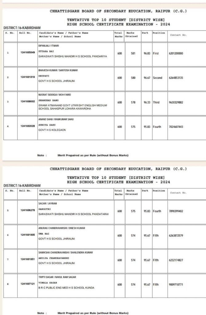विगत दिवस छ. ग. माध्यमिक शिक्षा मंडल, रायपुर द्वारा जारी हाई स्कूल परीक्षा 2024 में कु. दीपांजलि बारमते ने पूरे जिले में प्रथम स्थान हासिल कर परिवार सहित पूरे कवर्धा जिले का नाम रोशन कर गौरवान्वित किया है। वह 600 में से 581 अंक अर्जित कर कवर्धा जिला टाॅपर रही। राज्य टॉप 10 में 583 अंक रहा, इस तरह सिर्फ 2 अंक से वह राज्य स्तर पर टाॅप 10 से चुक गयी । उन्होंने सामाजिक विज्ञान विषय में 100 अंक में 100 अंक हासिल किया है। कु. दीपांजलि विकास खण्ड पंडरिया के ग्राम बांधा की रहने वाली है । वह सरस्वती शिशु मंदिर उच्चतर माध्यमिक विद्यालय, पंडरिया में पढ़ाई करते हुए कड़ी मेहनत से यह स्थान प्राप्त की है,उनके पिता जी इतवारी बारमते,माता श्रीमती उत्तरा बारमते कृषि मजदूरी करते है। जिला का टॉपर लिस्ट जारी हुआ तो कु. दीपांजलि प्रथम स्थान पर रही। इस समाचार से परिवार सहित पूरे क्षेत्र में हर्ष व्याप्त हो गया और बधाई देने वालों का तांता लग गया। विद्यालय के शिक्षकों सहित सैकड़ों लोगों ने फोन कर बधाई दिए ।
