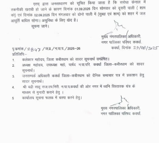 कवर्धा, 30 अगस्त 2025। नगर पालिका परिषद कवर्धा द्वारा जारी सूचना के अनुसार सरोधा केनाल में तकनीकी खराबी आने के कारण आगामी 1 सितंबर 2025 सोमवार की शाम की पाली और 2 सितंबर 2025 मंगलवार को सुबह एवं शाम दोनों पाली में शहर में जल आपूर्ति बाधित रहेगी। नगर पालिका प्रशासन ने आम जनता से सहयोग की अपील करते हुए कहा है कि असुविधा के लिए खेद है। नागरिकों से अनुरोध है कि वे आवश्यकतानुसार जल का संग्रह पूर्व में कर लें।