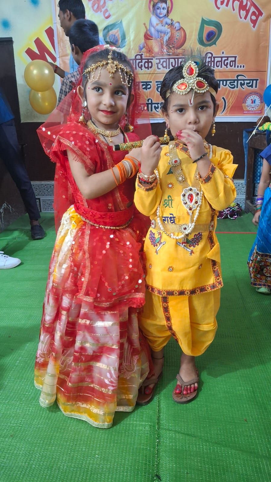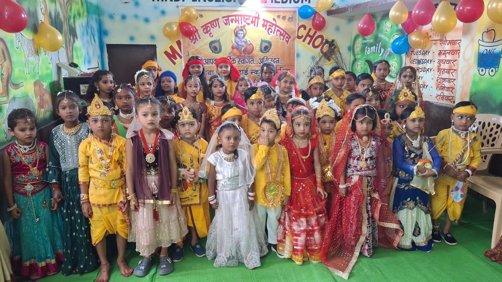 स्कूल के छोटे बड़े बच्चो की मनोरम झाकियां दिखाई दिया और बच्चो ने जन्माष्टमी पर्व को बहुत ही अच्छे और प्यार से श्री कृष्ण राधा जी के वेश भूषा में राधे राधे का नाम लेते हुए जन्मदिन मनाया गया। और स्कूल के तरफ से बच्चो को शिक्षक द्वारा जन्माष्टमी पर्व में श्री कृष्ण का गुणगान किया और बच्चो को श्री राधा नाम का भाव भजन कर जन्मदिन मनाया।