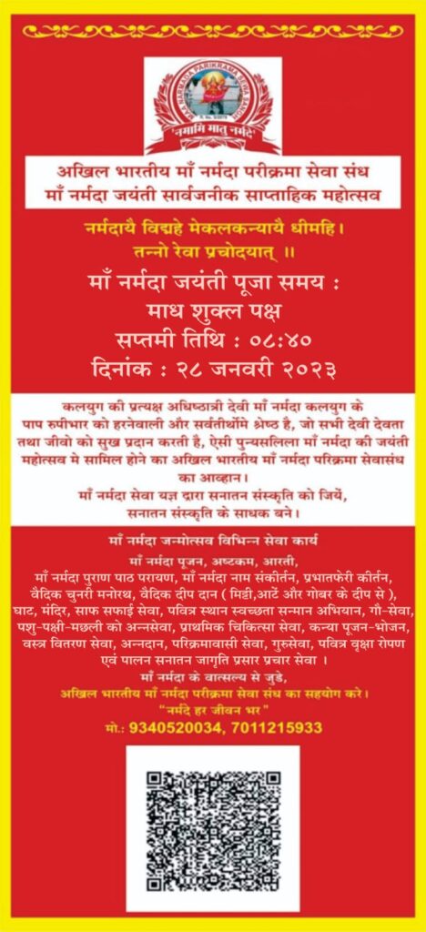 अखिल भारतीय मां नर्मदा परिक्रमा सेवा संघ के संयोजक सतीश चौबे की अध्यक्षता में हुई बैठक में निर्णय लिया गया है कि कलयुग की अधिष्ठात्री देवी मां नर्मदा का जन्मोत्सव नर्मदा तट के साथ ही पूरे देश में मध्यप्रदेश, गुजरात, महाराष्ट्र सहित जम्मू कश्मीर,त्रिपूरा, तामिल नाडु, गोवा, हरियाणा, कर्नाटक,अंदामा निकोबार , कश्मीर से कन्याकुमारी तक एवं विदेश में दुबई, ओस्ट्रेलिया, नेपाल, लंदन, अमेरिका में स्थित अखिल भारतीय मां नर्मदा परिक्रमा सेवा संघ के प्रतिनिधि पदाधिकारियों, सदस्यो जहां मां नर्मदा के भक्त हैं मनायेंगे और मां नर्मदा सेवा भावधारा से सनातन संस्कृति के सभी क्षेत्रों को संयोजित करेगे , अखिल भारतीय मां नर्मदा परिक्रमा सेवा संघ हमारी बिसरी वैदिक परंपरा को जीवन में सम्मिलित हो इस उद्देश्य से हरियाली अमावस्या तिथि पर २८/७/२०२२ को अखिल भारतीय मां नर्मदा परिक्रमा सेवा संघ के आह्वान पर देश भर में पवित्र स्थानों, आश्रमों, बाग,खेत मेदानो तथा पवित्र नदियों के तटिय गांव, शहरों में १५०० से भी अधिक स्थानों पर लाखों की संख्या में वृक्षारोपण और वृक्ष पालन सेवा कार्य किया है, दिपावली पूजन २५/१०/२०२२ को अखिल भारतीय मां नर्मदा परिक्रमा सेवा संघ के आह्वान पर देशभर में वैदिक दिप दान, गौमाता सेवा के साथ पवित्र स्थानों, तीर्थों, मंदिरों, पवित्र नदियों के घाटों पर साफ सफाई सेवा जागृति अभियान चलाया गया था, अखिल भारतीय मां नर्मदा परिक्रमा सेवा संघ के स्वयंसेवकों पदाधिकारि परिक्रमा वासी भक्तों की सेवा में समर्पित सेवा क्षेत्रों को संयोजित कर उनके सहयोग उत्तम सेवा, समाधान पर भी कार्यरत है । इस उद्देश्य से मध्यप्रदेश, गुजरात और महाराष्ट्र में परिक्रमा मार्ग के विभिन्न अन्नक्षेत्र, सदा व्रत, आश्रमों तथा गृहस्थ सेवा को सहयोग करना तथा परिक्रमा वासी कि मुफ्त प्राथमिक आयुर्वेदिक चिकित्सा उपचार केम्प सेवा , तपस्वी साधु संतों कि सेवा , बाल संस्कार केन्द्र, गुरु कुल शिक्षा, आचार्यों द्वारा शास्त्री का यथारुप प्रसार प्रचार, प्रभातफेरी कीर्तन परंपरा , मंदिर घाटों के नवनिर्माण , पौराणिक मंदिर, घाटों जिर्णोद्धार ,पर्यावरण संरक्षण निमीत वृक्षारोपण, पवित्र स्थानों पर साफ़ सफाई सेवा, सहयोग, समाधान जागृति अभियान,जैविक खेती प्रसार प्रचार, जैविक रोजगार प्रोत्साहन, संस्कृति रक्षण निमित मातृशक्ति अस्मिता उत्कर्ष के कार्य , बाल संस्कार और वैदिक गुरु कुल शिक्षा से सनातन संस्कार चरित्र निर्माण कार्य, नैतिक कर्तव्य प्रति युवा शक्ति जागृति कार्य, गौमाता संरक्षण और संवर्धन के कार्य,गंदे नाले, कारखाने के प्रदुषित पानी की रोक के लिए जागरूकता, स्थानिक तथा सरकारी सहयोग से मेड़ बांध, संरक्षण दिवाल जैसे कार्य जनभ