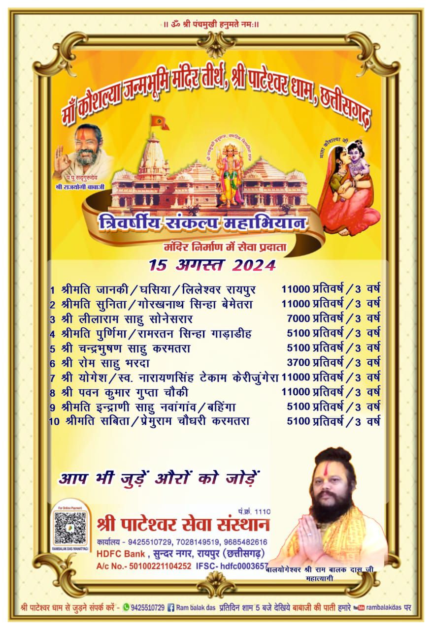 ,,मां कौशल्या,, गोद में रामलला को लेकर विराजमान होगी ,,, 2026 में इस तीर्थ के निर्माण को पूर्ण करने के लिए 3 वर्षीय संकल्प अभियान चल रहा है आशा करता हूं कि आप भी एक निश्चित राशि का 3 वर्ष के लिए संकल्प करके जुड़ चुके होंगे ,