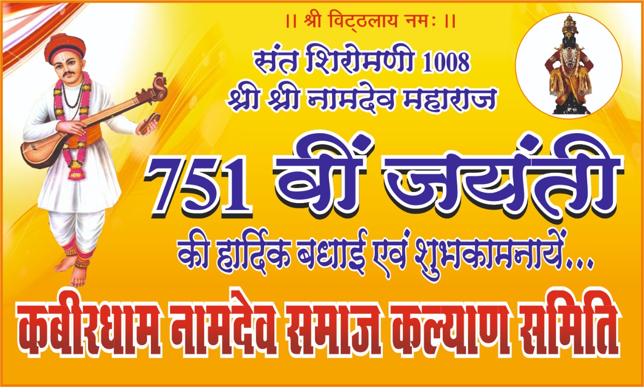 कबीरधाम जिले में कबीरधाम नामदेव समाज (पंजीकृत) द्वारा संत नामदेव जी की 751 वी जयंती बडी ही धूमधाम से 23 नवम्बर 2021 दिन मंगलवार को सुबह 10 बजे कवर्धा के नामदेव मोहल्ला के श्री विजय नामदेव अजय नामदेव के निवास स्थान से सभी सामाजिक बन्धुवों के उपस्थिति में बेंड बजे गाजे के साथ राधकृष्ण मन्दिर हेतु रवाना हुई