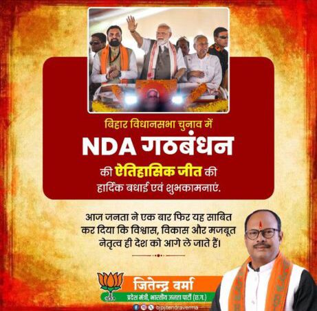 भाजपा प्रदेश मंत्री जितेन्द्र वर्मा ने इस ऐतिहासिक जीत के लिए प्रधानमंत्री नरेंद्र मोदी जी, केंद्रीय मंत्री अमित शाह जी, राष्ट्रीय अध्यक्ष जेपी नड्डा जी, एनडीए गठबंधन के शीर्ष नेतृत्व, भाजपा बिहार प्रदेश अध्यक्ष, भाजपा पदाधिकारी, विजयी प्रत्याशियों एवं देवतुल्य कार्यकर्ताओं व बिहारवासियों को ऐतिहासिक जीत की बधाई एवं शुभकामनाएं दी। आगे उन्होंने कहा कि एनडीए सरकार बिहार के सर्वांगीण विकास, रोजगार के नए अवसर, आधारभूत संरचना के विस्तार, कृषि उत्थान, महिला सशक्तिकरण और सामाजिक न्याय की दिशा में निरंतर कार्य करती रहेगी। जनता द्वारा दिया गया प्रत्येक वोट एक जिम्मेदारी है, जिसे एनडीए गठबंधन पूरी ईमानदारी और समर्पण के साथ निभाएगी।