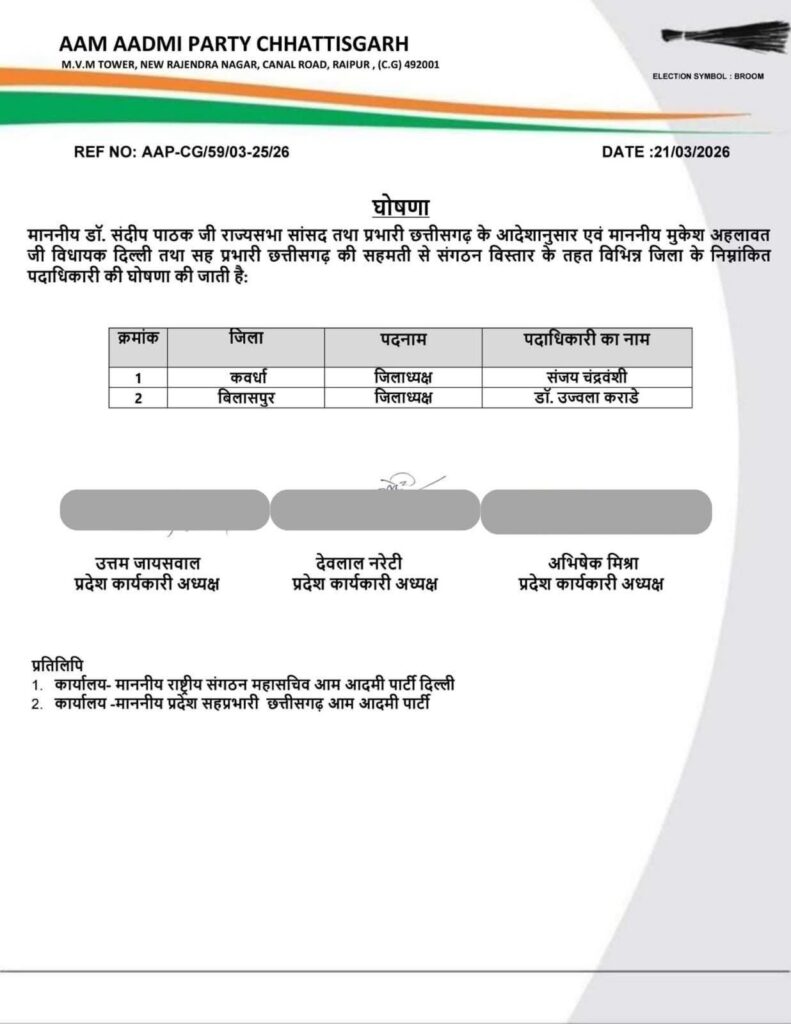 यह नियुक्ति राज्यसभा सांसद डॉ. संदीप पाठक के मार्गदर्शन, छत्तीसगढ़ प्रभारी के निर्देश तथा विधायक मुकेश अहलावत की सहमति से की गई है। पार्टी नेतृत्व का मानना है कि इस नियुक्ति से कबीरधाम जिले में संगठन को नई मजबूती मिलेगी और जमीनी स्तर पर पार्टी की पकड़ और अधिक सुदृढ़ होगी।
