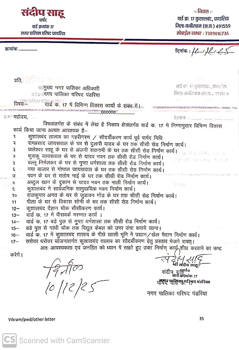 पंडरिया वार्ड क्रमांक 17 पार्षद संदीप साहू ने आवश्यक विकास कार्यों की मांग – कुशालबंद क्षेत्र में बदहाल बुनियादी सुविधाएँ।