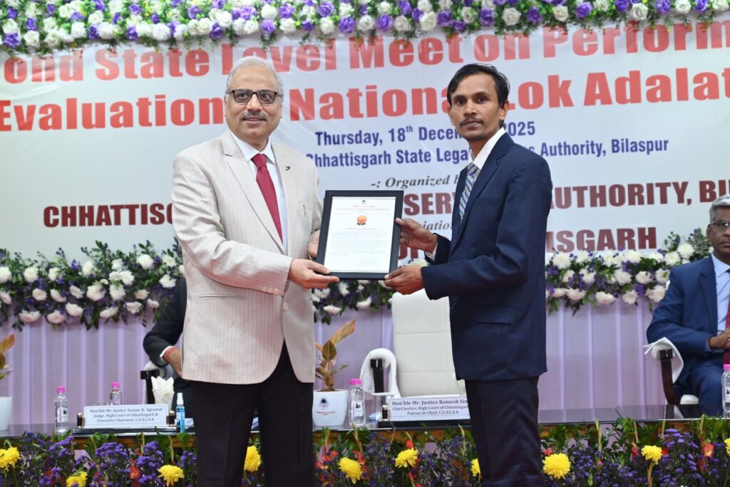 ज्ञात हो कि राष्ट्रीय लोक अदालत के प्रदर्शन एवं मूल्यांकन पर द्वितीय राज्य स्तरीय बैठक गुरुवार, 18 दिसंबर, 2025 को कॉन्फ्रेंस हॉल, छत्तीसगढ़ राज्य विधिक सेवा प्राधिकरण, बिलासपुर में आयोजित की गई। मुख्य अतिथि छत्तीसगढ़ उच्च न्यायालय के मुख्य न्यायाधीश और छत्तीसगढ़ राज्य विधिक सेवा प्राधिकरण के संरक्षक-प्रमुख न्यायमूर्ति रमेश सिन्हा थे। विशेष अतिथि छत्तीसगढ़ उच्च न्यायालय के न्यायाधीश और छत्तीसगढ़ राज्य विधिक सेवा प्राधिकरण के कार्यकारी अध्यक्ष न्यायमूर्ति संजय के. अग्रवाल थे। विशिष्ट अतिथि छत्तीसगढ़ उच्च न्यायालय के न्यायाधीश और उच्च न्यायालय विधिक सेवा समिति के अध्यक्ष न्यायमूर्ति पार्थ प्रतीम साहू थे। छत्तीसगढ़ उच्च न्यायालय के न्यायाधीशों की गरिमामयी उपस्थिति में यह बैठक संपन्न हुई।