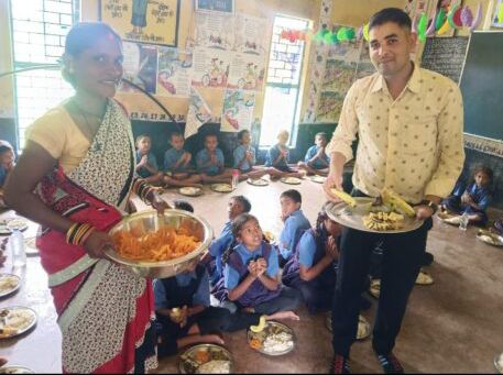 खैरागढ़ छुईखदान गंडई – शासकीय प्राथमिक शाला पुरेना संकुल केन्द्र घिरघोली विकास खंड छुईखदान जिला केसीजी छत्तीसगढ़ में पुलिस आरक्षक ग्राम पुरेना निवासी धर्मेंद्र जंघेल ने अपने पुत्र ध्रुव जंघेल के चौथे जन्म दिवस पर शासकीय प्राथमिक शाला पुरेना के बच्चों को सम्पूर्ण न्यौता भोज कराया जिसमें चांवल, दाल सब्जी जलेबी और केले खिलाया और बच्चों के साथ बैठकर स्वयं मध्यान्ह भोजन किया और बच्चों को पढ़ाई लिखाई हेतु प्रेरित किया पिछले वर्ष भी बच्चों को न्यौता भोज कराया था जब भी अवकाश में आते हैं प्रधान पाठक तुलेश्वर कुमार सेन से मिलकर शाला में होने वाली गतिविधियों से अवगत होते हैं और अपना मार्ग दर्शन देते रहते हैं वे भी इसी शाला से पढ़ लिखकर आगे बढ़े और अपने अनुभव को बच्चों को बताया आज के कार्यक्रम आरक्षक धर्मेंद्र जंघेल,प्रधान पाठक तुलेश्वर कुमार सेन,सहायक शिक्षक गोकुल राम वर्मा,रसोइया मान बाई, सुरजा बाई सहित छात्र छात्राएं उपस्थित रहे।