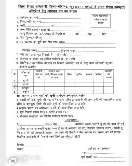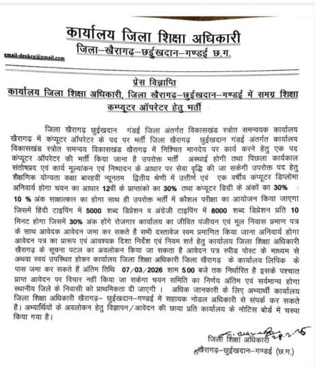 जिला खैरागढ़ छुईखदान गंडई अंतर्गत कार्यालय विकासखंड स्त्रोत समन्वय विकासखंड खैरागढ़ में निश्चित मानदेय पर कार्य करने हेतु एक पद कंप्यूटर ऑपरेटर की भर्ती किया जाना है। उपरोक्त भर्ती अस्थाई होगी तथा पिछला कार्यकाल संतोषप्रद एवं कार्य मूल्यांकन एवं निष्पादन के आधार पर सेवा वृद्धि की जा सकेगी उपरोक्त पद हेतु शैक्षणिक योग्यता कक्षा बारहवीं न्यूनतम द्वितीय श्रेणी में उत्तीर्ण एवं एक वर्षीय कंप्यूटर डिप्लोमा अनिवार्य होगा चयन का आधार 12वीं के प्राप्तांको का 30% तथा कंप्यूटर डिग्री के अंकों का 30% , 10 %अंक साक्षात्कार का होगा साथ ही उपरोक्त भर्ती में कौशल परीक्षा का आयोजन किया जाएगा। जिसमें हिंदी टाइपिंग में 5000 शब्द डिप्रेशन व अंग्रेजी टाइपिंग में 8000 शब्द डिप्रेशन प्रति 10 मिनट होगा जिसमें 30% अंक होंगे रोजगार कार्यालय का जीवित पंजीयन एवं मूल निवास प्रमाण पत्र के साथ आवेदक आवेदन जमा कर सकते है सभी दस्तावेज स्वम प्रमाणित किया जाना अनिवार्य होगा आवेदन पत्र का प्रारूप एवं आवश्यक दिशा निर्देश एवं नियम शर्त हेतु कार्यालय जिला शिक्षा अधिकारी खैरागढ़ के सूचना पटल का अवलोकन किया जा सकता है। आवेदन पत्र स्पीड पोस्ट के माध्यम से अथवा स्वयं उपस्थित होकर कार्यालय जिला शिक्षा अधिकारी जिला खैरागढ़ के कार्यालय लिपिक के पास जमा कर सकते हैं अंतिम तिथि 07/03/ 2026 शाम 5:00 बजे तक निर्धारित है। इसके पश्चात प्राप्त आवेदन पर विचार नहीं किया जा सकेगा चयन समिति का निर्णय अंतिम एवं सर्वमान्य होगा स्थानीय जिले के निवासी को प्राथमिकता दी जाएगी ।