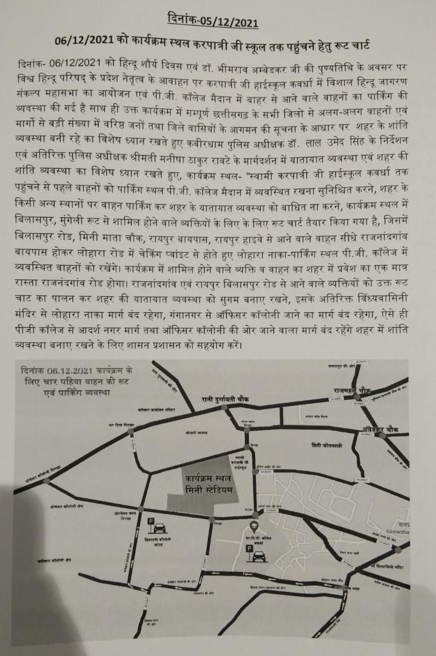 दिनांक- 06/12/2021 को हिन्दू शौर्य दिवस एवं डॉ. भीमराव अम्बेडकर जी की पुण्यतिथि के अवसर पर विश्व हिन्दू परिषद् के प्रदेश नेतृत्व के आवाहन पर करपात्री जी हाईस्कूल कवर्धा में विशाल हिन्दू जागरण संकल्प महासभा का आयोजन एवं पी.जी. कॉलेज मैदान में बाहर से आने वाले वाहनों का पार्किंग की व्यवस्था की गई है। साथ ही उक्त कार्यक्रम में सम्पूर्ण छत्तीसगढ़ के सभी जिलो से अलग-अलग वाहनों एवं मार्गो से बड़ी संख्या में वरिष्ठ जनों तथा जिले वासियों के आगमन की सूचना के आधार पर शहर के शांति व्यवस्था बनी रहे का विशेष ध्यान रखते हुए कबीरधाम पुलिस अधीक्षक डॉ लाल उमेद सिंह के निर्देशन एवं अतिरिक्त पुलिस अधीक्षक श्रीमती मनीषा ठाकुर रावटे के मार्गदर्शन में यातायात व्यवस्था एवं शहर की शांति व्यवस्था का विशेष ध्यान रखते हुए, कार्यक्रम स्थल- “स्वामी करपात्री जी हाईस्कूल कवर्धा तक पहुंचने से पहले वाहनों को पार्किंग स्थल”पी.जी. कॉलेज मैदान में व्यवस्थित रखना सुनिश्चित करने, शहर के किसी अन्य स्थानों पर वाहन पार्किंग कर शहर के यातायात व्यवस्था को बाधित ना करने, कार्यक्रम स्थल में बिलासपुर, मुंगेली रूट से शामिल होने वाले व्यक्तियों के लिए के लिए रूट चार्ट तैयार किया गया है। जिसमें बिलासपुर रोड, मिनी माता चौक, रायपुर बायपास, रायपुर हाइवे से आने वाले वाहन सीधे राजनांदगांव बायपास होकर लोहारा रोड में चेकिंग प्वांइट से होते हुए लोहारा नाका-पार्किंग स्थल पी.जी. कॉलेज में व्यवस्थित वाहनों को रखेंगे। कार्यक्रम में शामिल होने वाले व्यक्ति व वाहन का शहर में प्रवेश का मात्र एक रास्ता राजनंदगांव रोड होगा। राजनांदगांव एवं रायपुर बिलासपुर रोड से आने वाले व्यक्तियों को उक्त रूट चाट का पालन कर शहर की यातायात व्यवस्था को सुगम बनाए रखने, इसके अतिरिक्त विंध्यवासिनी मंदिर से लोहारा नाका मार्ग बंद रहेगा, गंगानगर से ऑफिसर कॉलोनी जाने का मार्ग बंद रहेगा, ऐसे ही पीजी कॉलेज से आदर्श नगर मार्ग तथा ऑफिसर कॉलोनी की ओर जाने वाला मार्ग बंद रहेंगे शहर में शांति व्यवस्था बनाए रखने के लिए शासन प्रशासन को सहयोग करें।