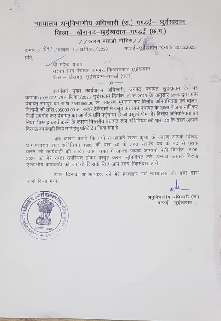 वित्तीय अनियमितता बरतने पर एस डी एम छुईखदान ने कारण बताओ नोटिस जारी किया 65 लाख गबन के आरोप में सरपंच महेंद्र यादव को 15 जून का समय दिया