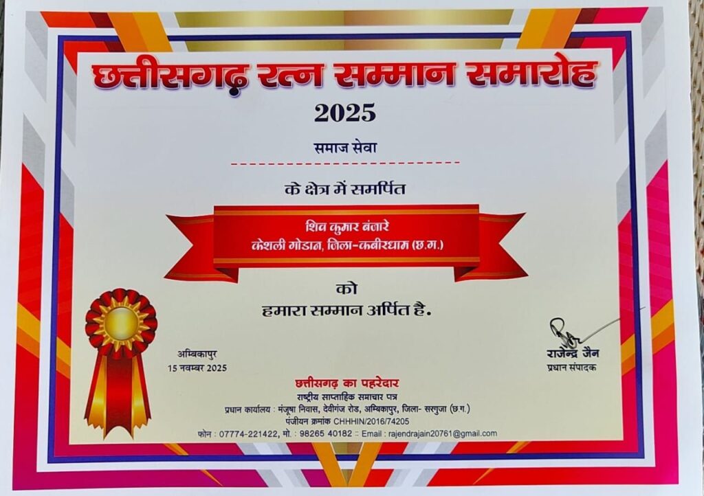 कवर्धा : समाजसेवा के क्षेत्र में छत्तीसगढ़ रत्न सम्मान से नवाजे गए शिवकुमार बंजारे