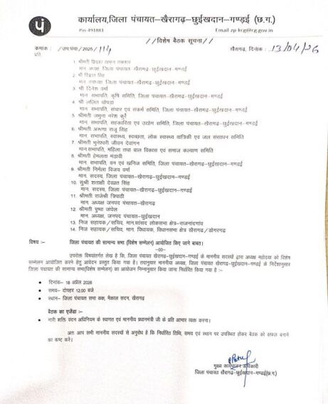 जिला पंचायत खैरागढ़-छुईखदान-गण्डई की सामान्य सभा (विशेष सम्मेलन) दिनांक 18 अप्रैल 2026 को दोपहर 12:00 बजे जिला पंचायत सभा कक्ष मैकाल सदन में आयोजित की जाएगी।