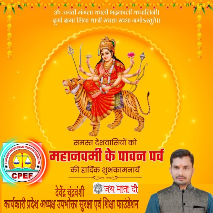 रायपुर। उपभोक्ता सुरक्षा एवं शिक्षा फाउंडेशन छत्तीसगढ़ के कार्यकारी प्रदेश अध्यक्ष देवेंद्र चंद्रवंशी प्रदेशवासियों को दुर्गाष्टमी और महानवमी की बधाई और शुभकामनाएं दी है। श्री चंद्रवंशी ने नवरात्रि के पावन अवसर पर मां दुर्गा से प्रदेशवासियों की सुख, समृद्धि और खुशहाली की प्रार्थना की है। उन्होंने कहा कि नवरात्रि देवी उपासना का पर्व है। पूरे देश में नौ दिनों तक देवी के नौ रूपों की भक्ति भाव से पूजा अर्चना की जाती है। इस अवसर पर घरों, मंदिरों में कन्या भोज कराया जाता है।