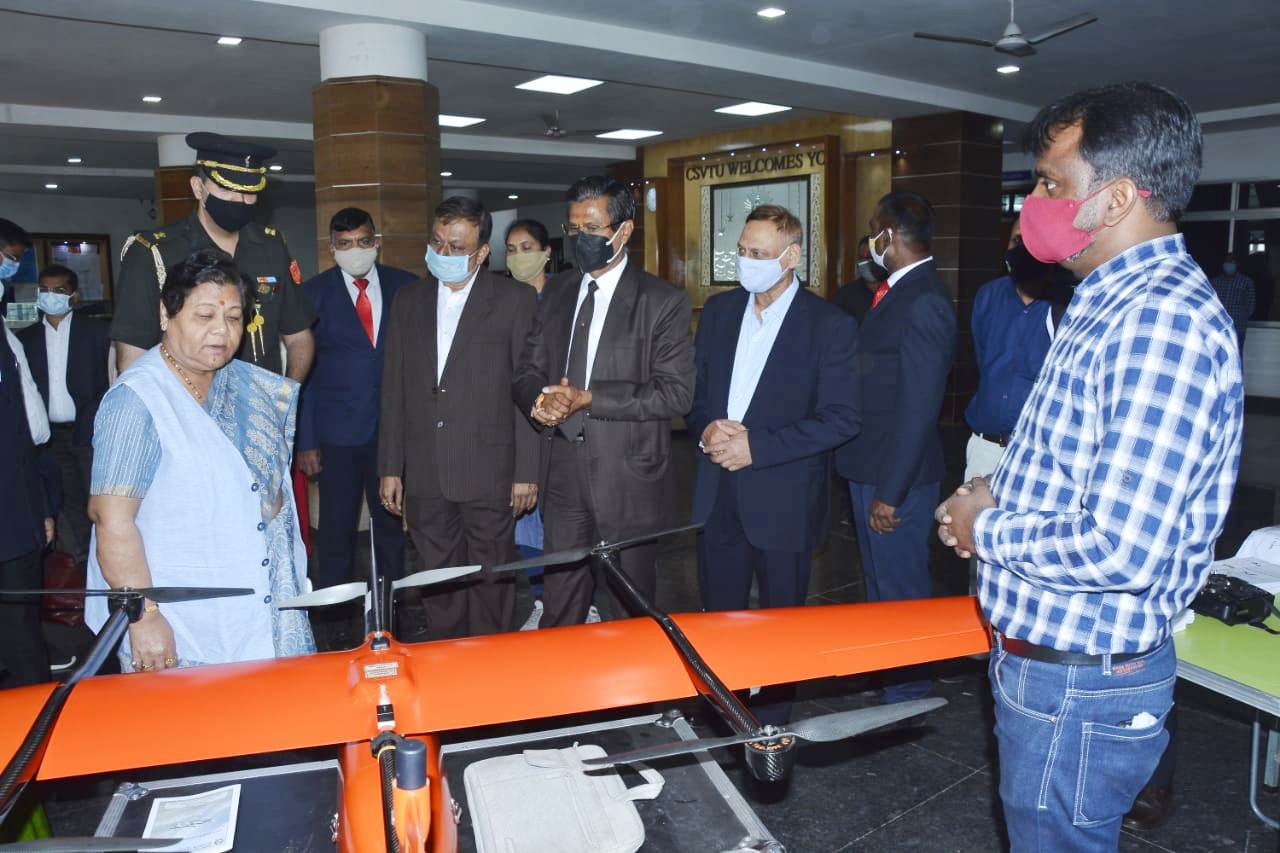 राज्यपाल सुश्री उइके स्वामी विवेकानंद टेक्निकल यूनिवर्सिटी पहुंचकर अल्ट्रा हाई रिवॉल्यूशन यूएवी मैपिंग मशीन का मुआयना किया। राज्यपाल ने इस मशीन को लोक निर्माण, ग्रामीण विकास, कृषि एवं जल संसाधन, लोक स्वास्थ्य तथा अन्य विभागों के लिए इसे उपयोगी बताया और कहा कि मास्टर प्लान के डिजाइन के लिए ऐसी मशीनें बहुत ही उपयोगी सिद्ध होगी। राज्यपाल ने विश्वविद्यालय परिसर के खाली पड़े क्षेत्रों के लिए सुझाव देते हुए कहा खाली जगहों पर बच्चों के मनोरंजन के लिए पार्क निर्माण करें और पर्यावरण के अनुकुल विकास करें। कुलपति श्री एम. के. वर्मा ने जानकारी देते हुए बताया कि ऊर्जा संरक्षण को ध्यान में रखते हुए उन्होंने पूरे परिसर को सोलर सिस्टम के रूप में तब्दील किया जिसकी राज्यपाल ने सराहना की।