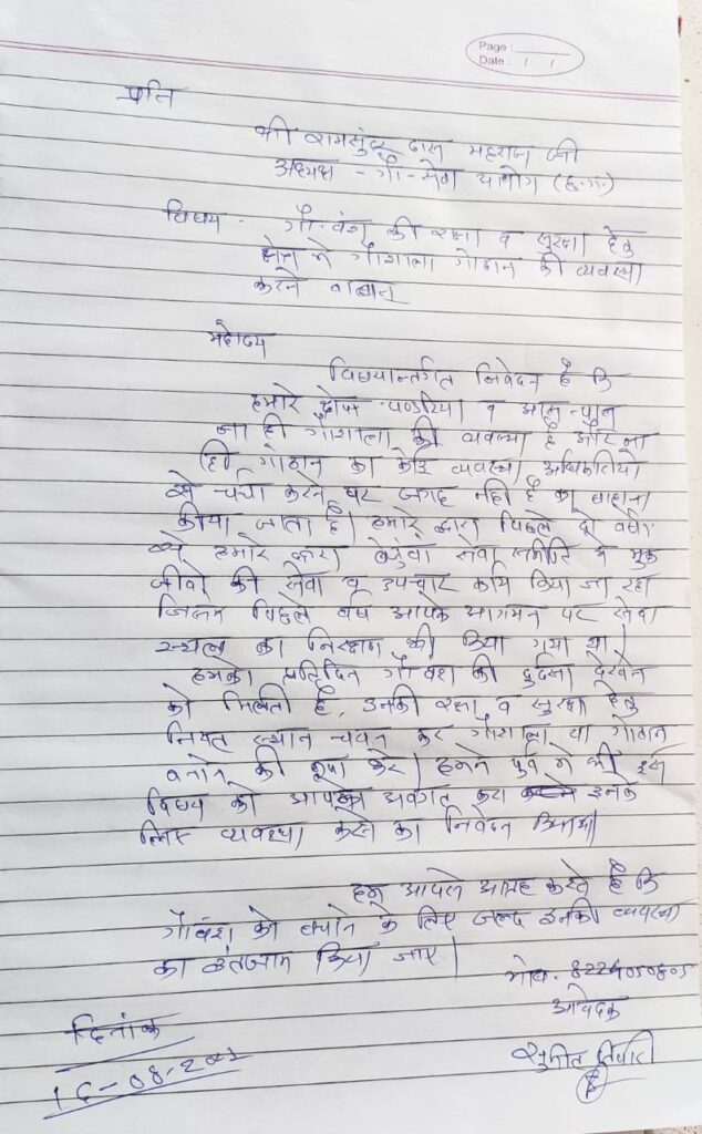 गौवंश की सुरक्षा व पशु चिकित्सक भर्ती हेतु गौसेवा अध्यक्ष को सौपा ज्ञापन -सुमीत तिवारी ।