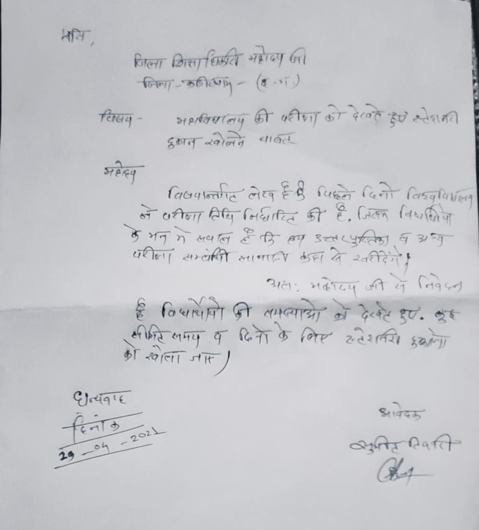 महाविद्यालय के परीक्षा को देखते हुए जिला शिक्षा अधिकारी को वाट्सप के माध्यम से सौपा ज्ञापन -सुमीत तिवारी